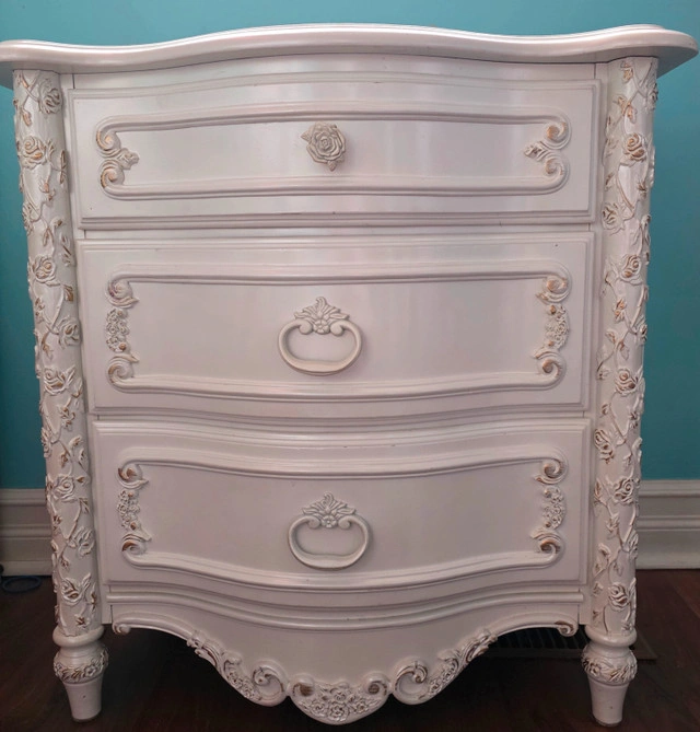 8 drawer + 2 small-drawer dresser with mirror, with matching 3-drawer nightstand. Both items have been well-loved and have light signs of wear, such as slight scratches. The wood is also cracked (see picture) in some minor areas. In addition, the sliding mechanism of the bottom drawer of the nightstand is broken but still functions. Very sturdy and elaborate. Contact for more or specific pictures and/or measurements. Near Scarborough Town Center.