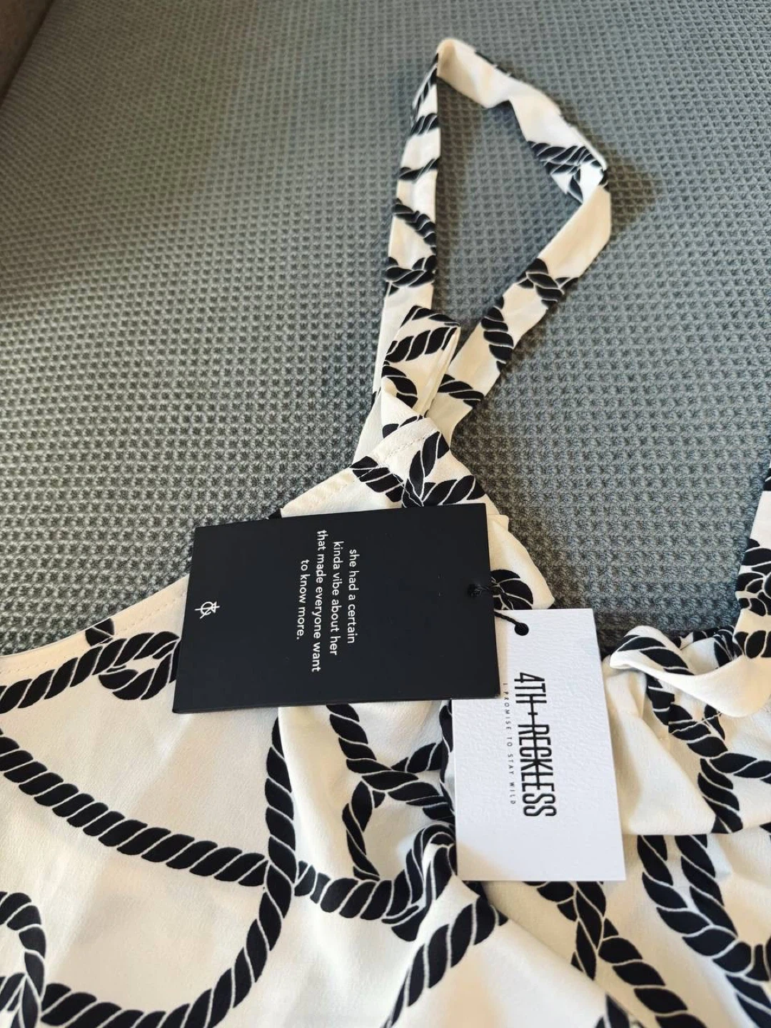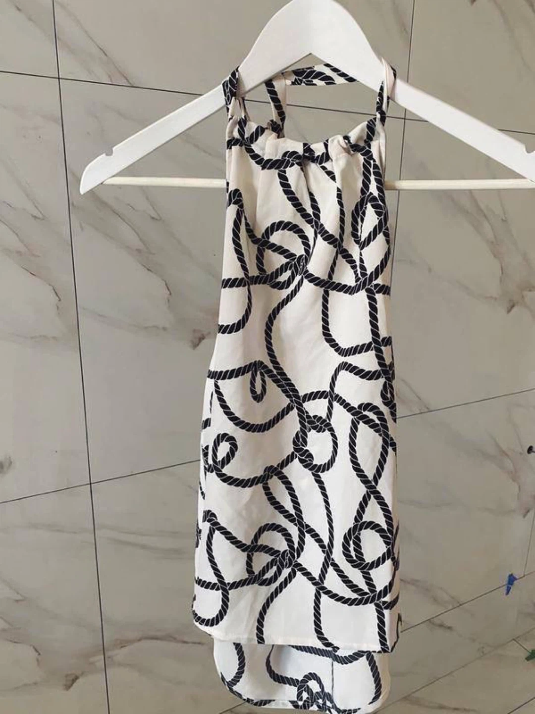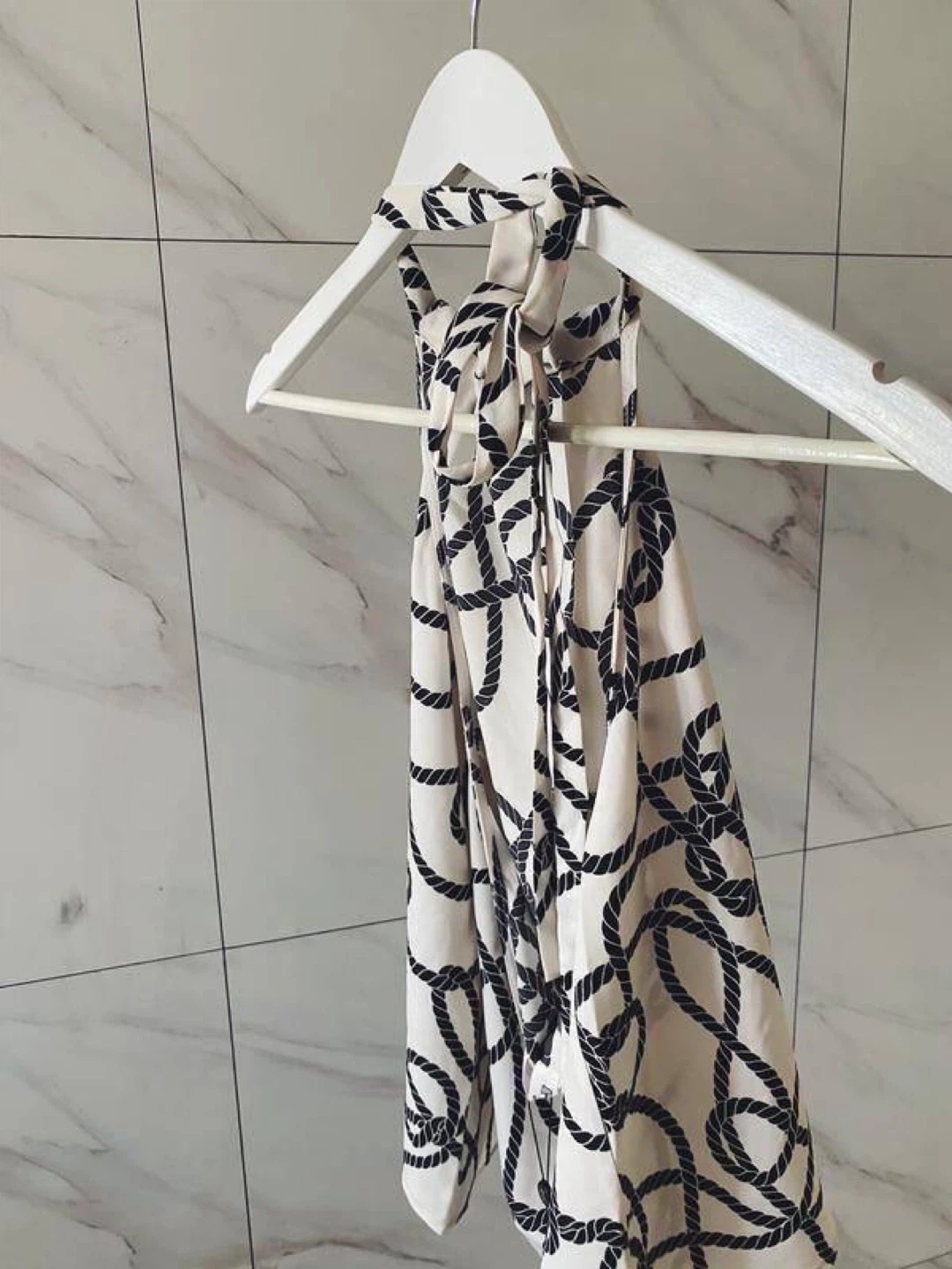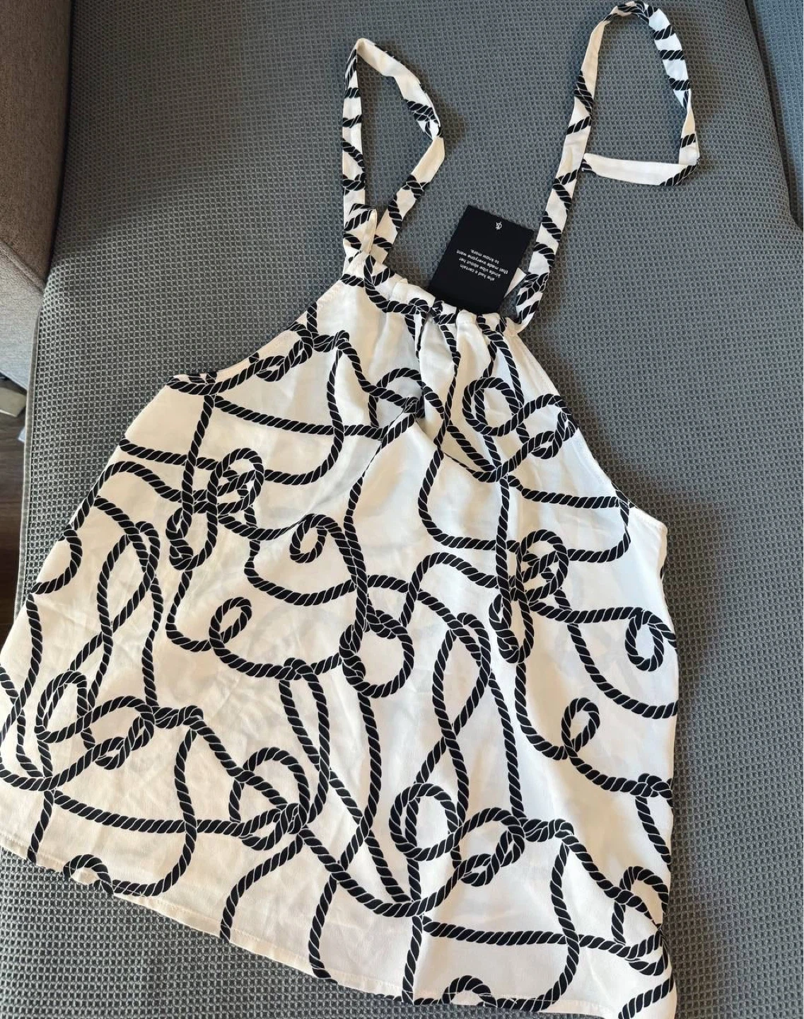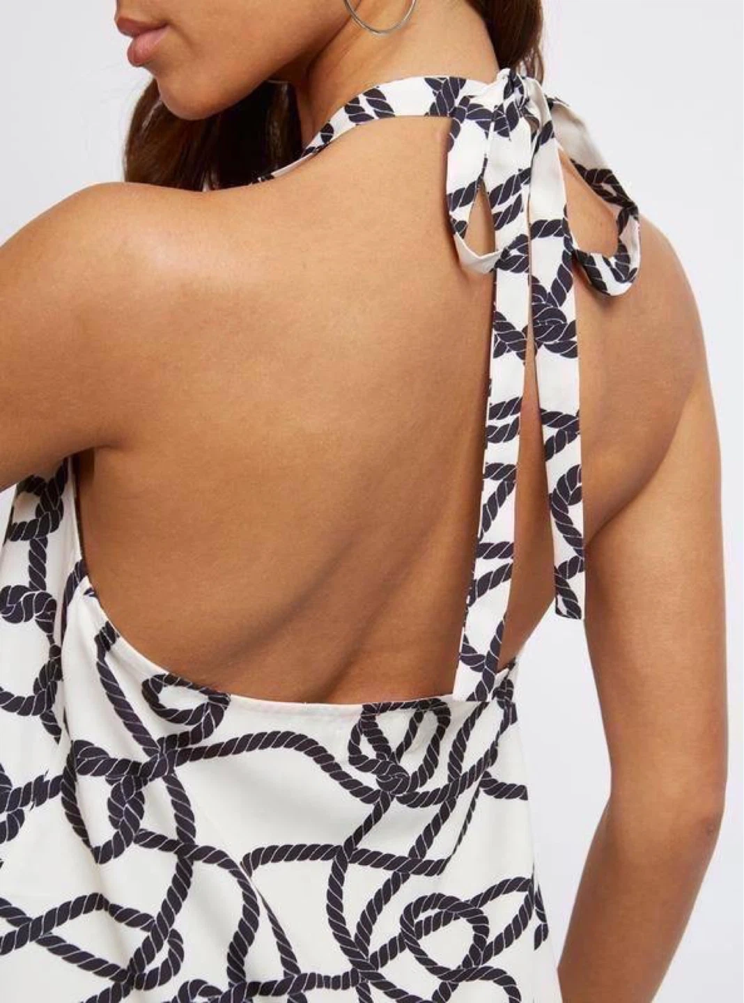 Stylish sleeveless blouse with a silky feel, featuring a tie at the neck and an open back. Lightweight flowing fabric with a white base and black rope-print design. Perfect for both casual outfits and evening looks. Trendy model from outlet with a discount.