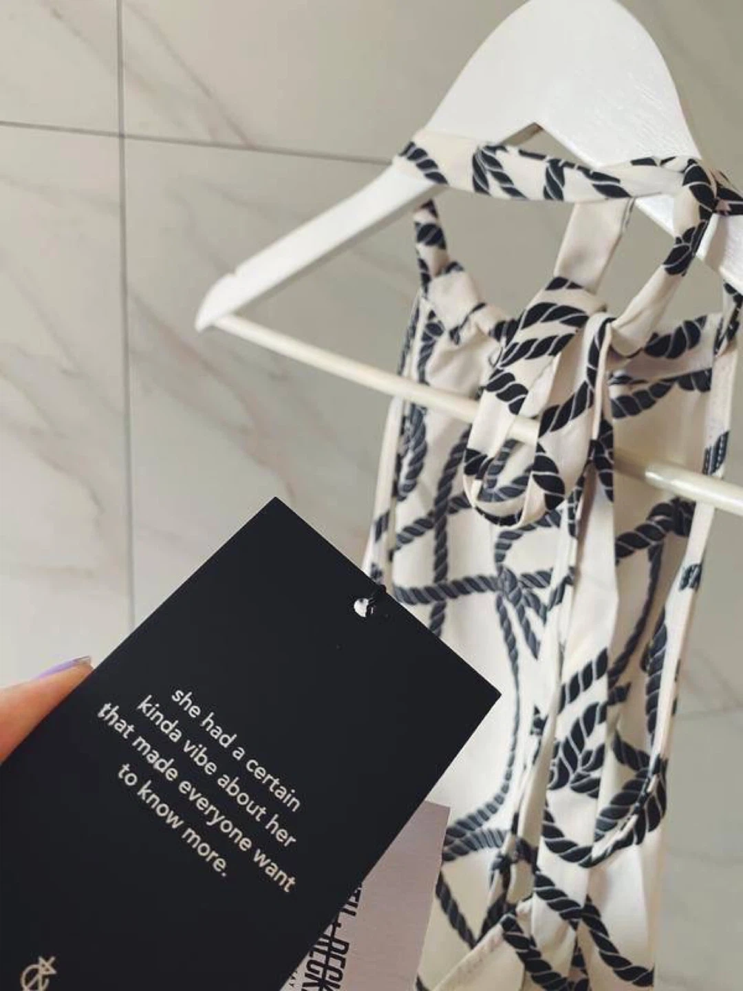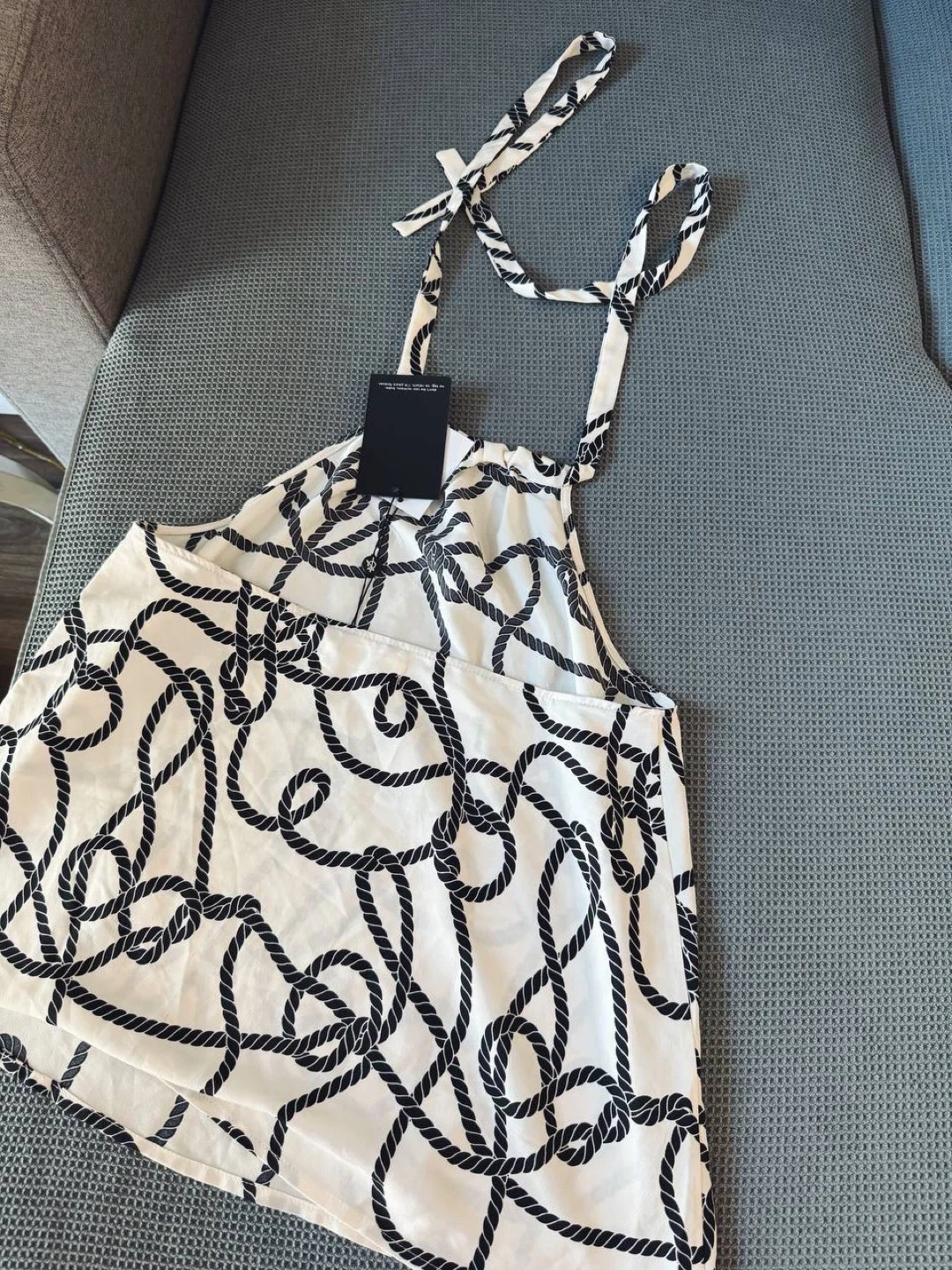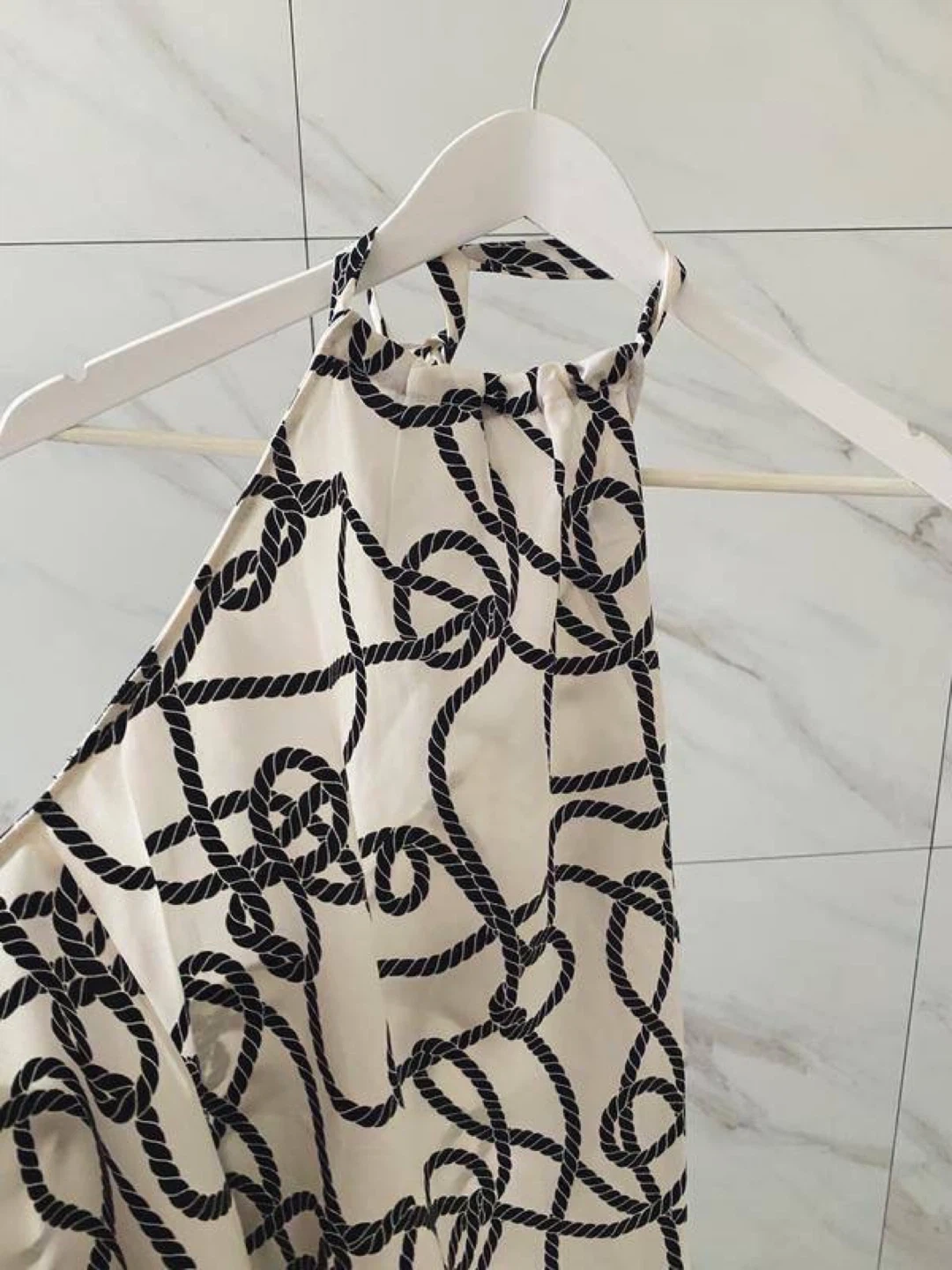 Stylish sleeveless blouse with a silky feel, featuring a tie at the neck and an open back. Lightweight flowing fabric with a white base and black rope-print design. Perfect for both casual outfits and evening looks. Trendy model from outlet with a discount.