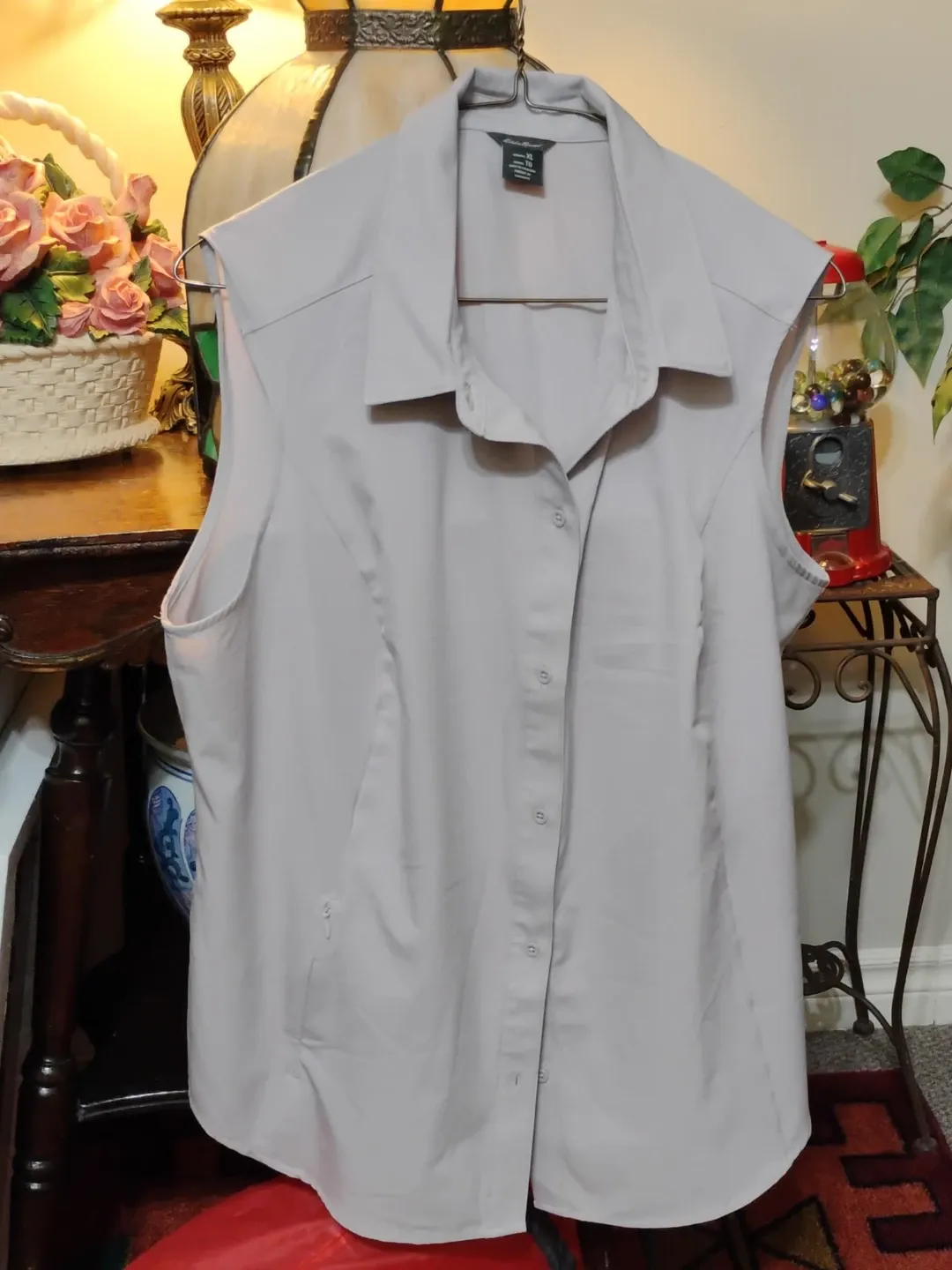 Eddie Bauer women's sleeveless button-up shirt in a light grey colour. It's a size XL. The shirt features a collared neckline and a button-down front. It has a small zippered pocket on the side.