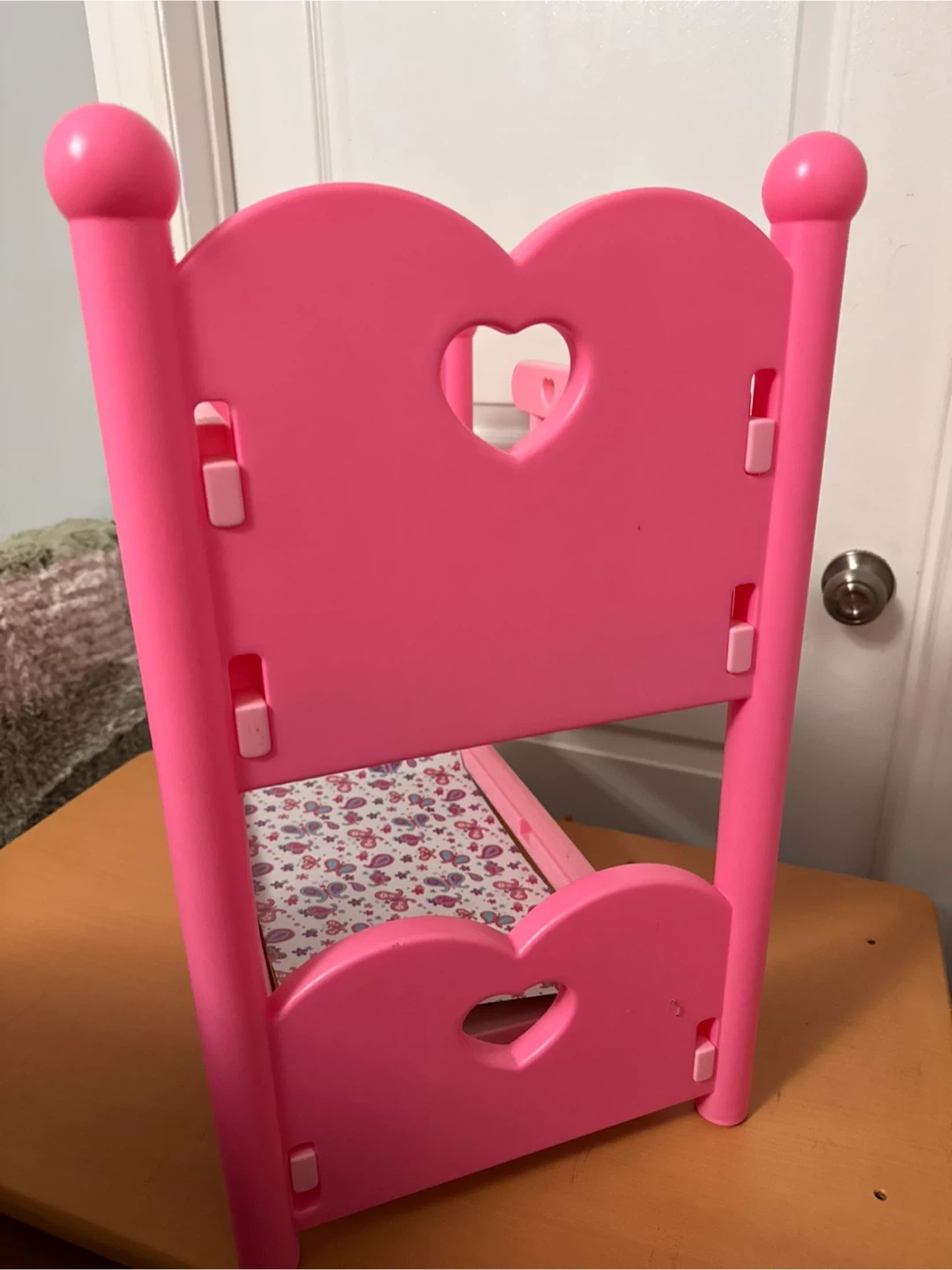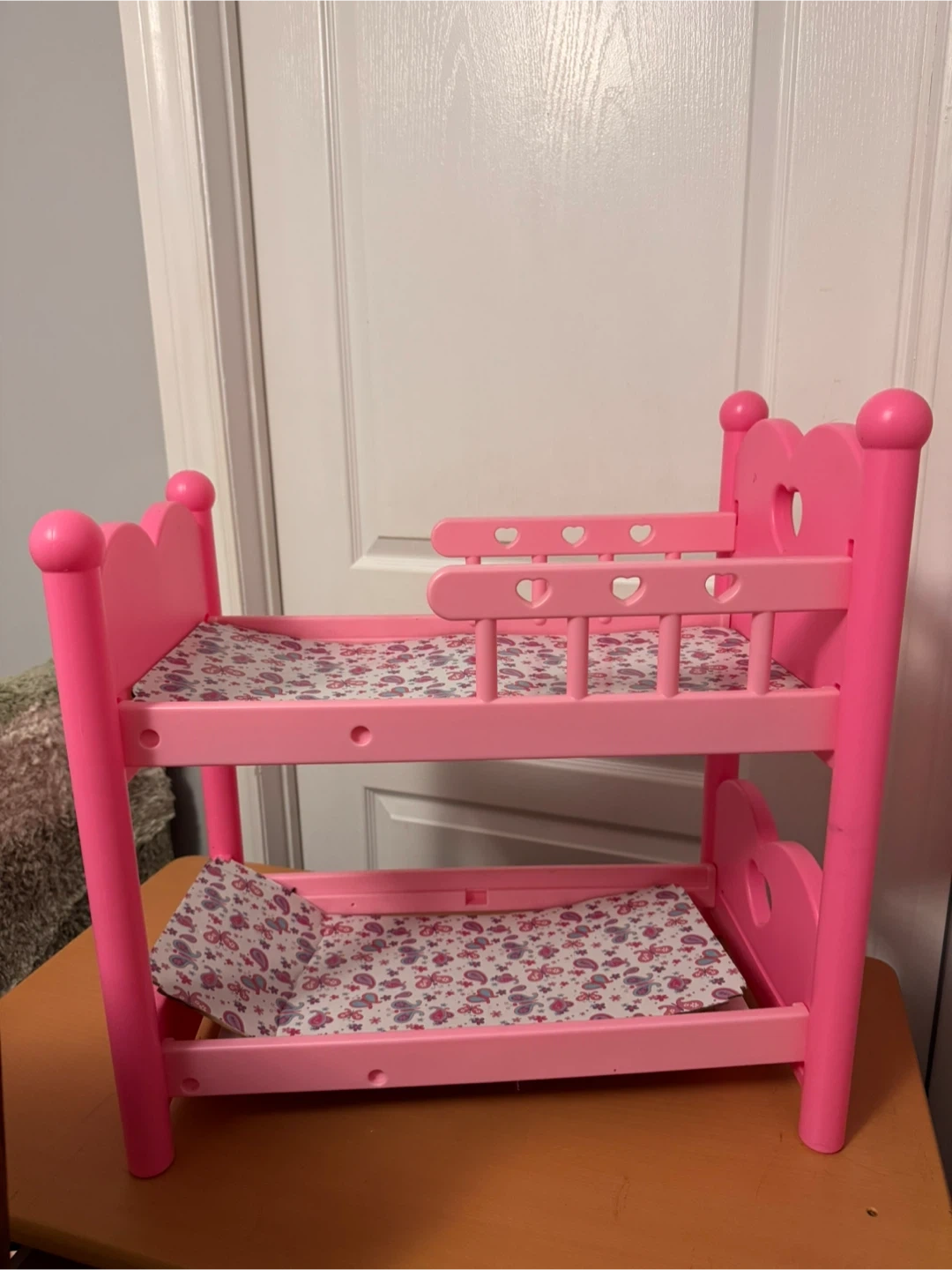 This pink bunk bed toy is designed for dolls. It features a cute heart cutout on the headboards and comes with bedding. It's perfect for imaginative play and storytelling!