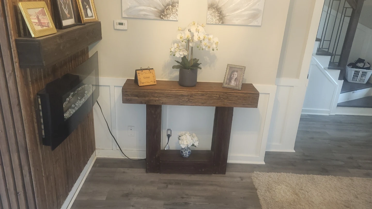 A sturdy wooden console table with a rustic finish. It features a lower shelf for extra storage or display. Great for an entryway or hallway!