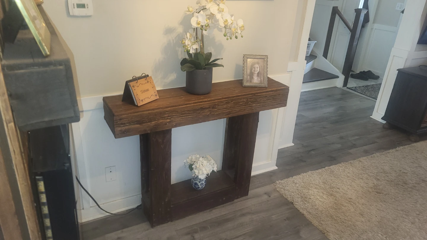 A sturdy wooden console table with a rustic finish. It features a lower shelf for extra storage or display. Great for an entryway or hallway!