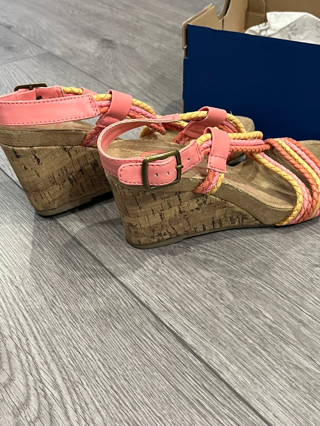 These Skechers wedge sandals feature a braided strap design in coral, pink, and yellow. They have a cork wedge heel and a buckle closure. Comes with original box.