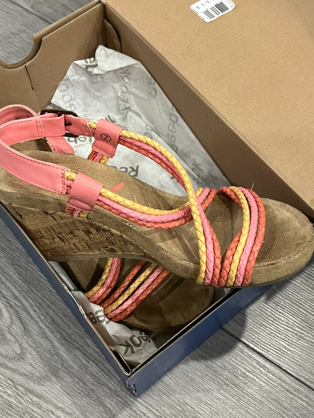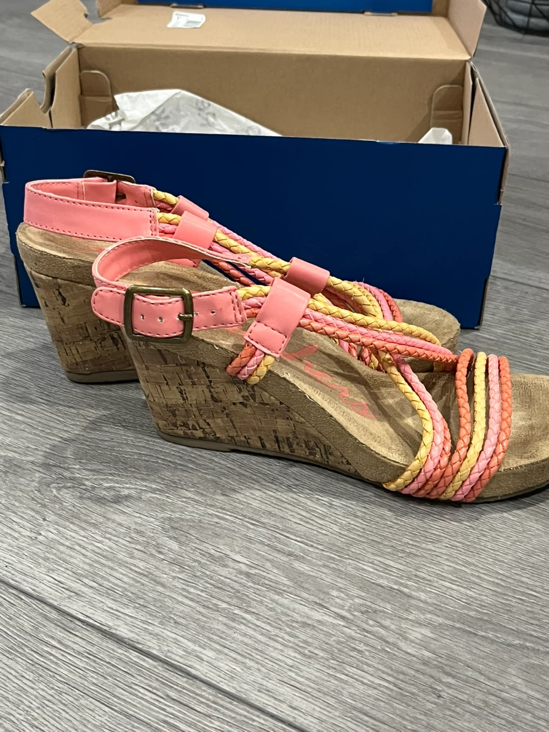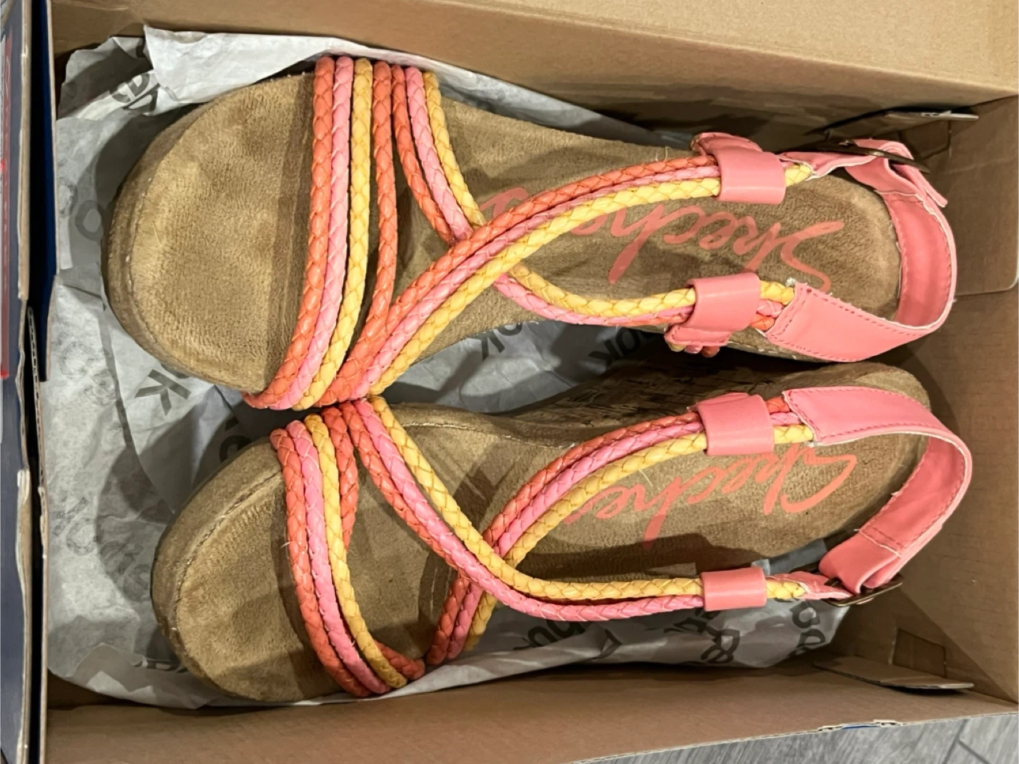 These Skechers wedge sandals feature a braided strap design in coral, pink, and yellow. They have a cork wedge heel and a buckle closure. Comes with original box.