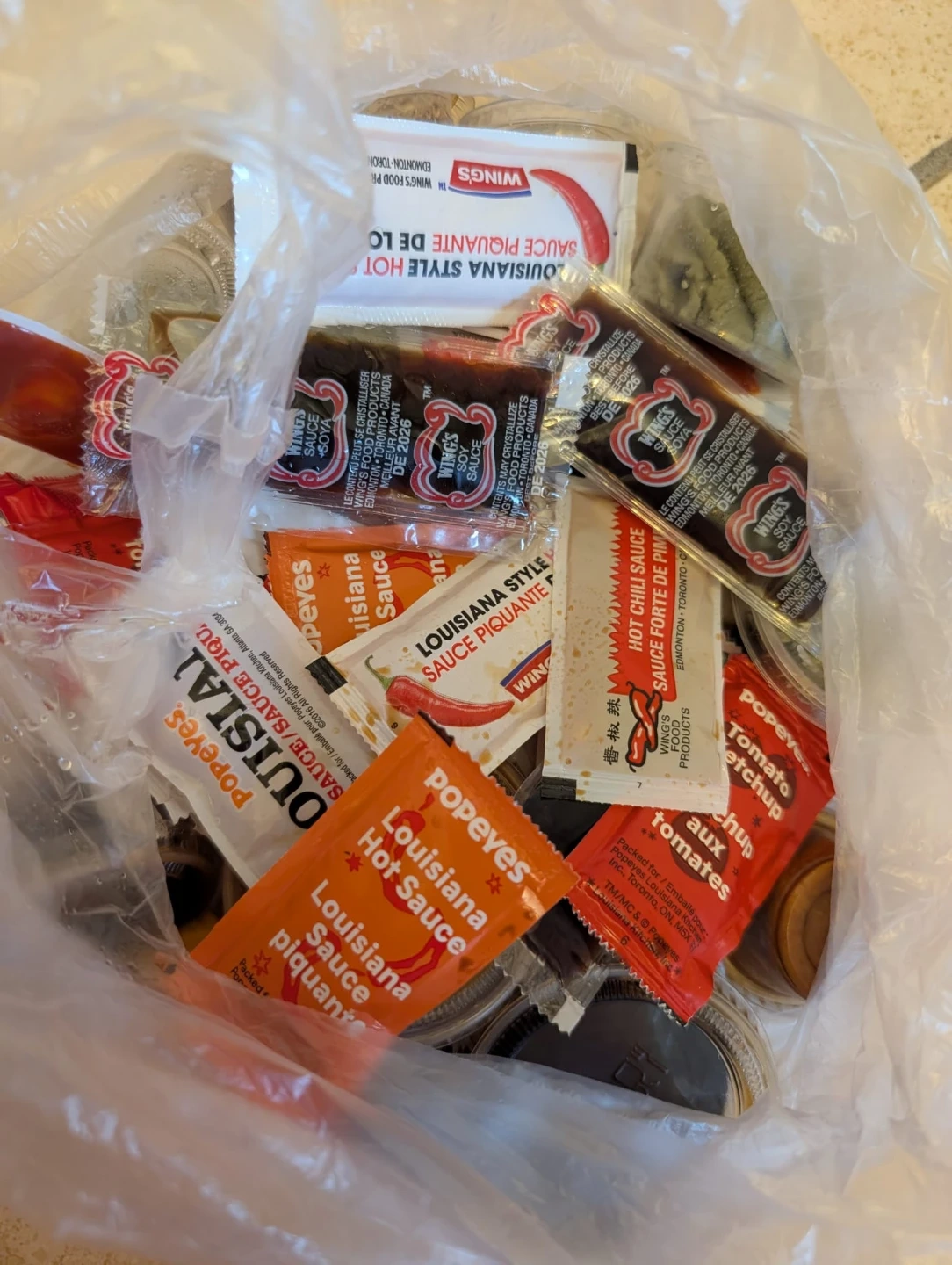 This is a collection of assorted sauce packets from Popeyes and Wing's. Includes Louisiana Hot Sauce, Tomato Ketchup, wasabi, and Soy Sauce.