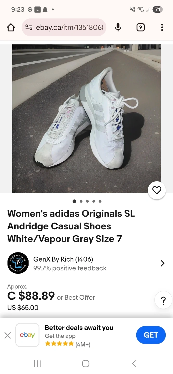 Womens Adidas Andridge SL sneakers size 6 with classic three-stripe detailing. Features a comfortable fit and durable sole. Good for everyday wear or light jogs! EBay seller asking for $88 cad. Priced to sell