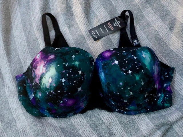 Brand new with tags Torrid 360 push-up t-shirt bra in a size 40D. Features a fun galaxy print. Originally purchased for $68.90. If the ad is up, it's still available!