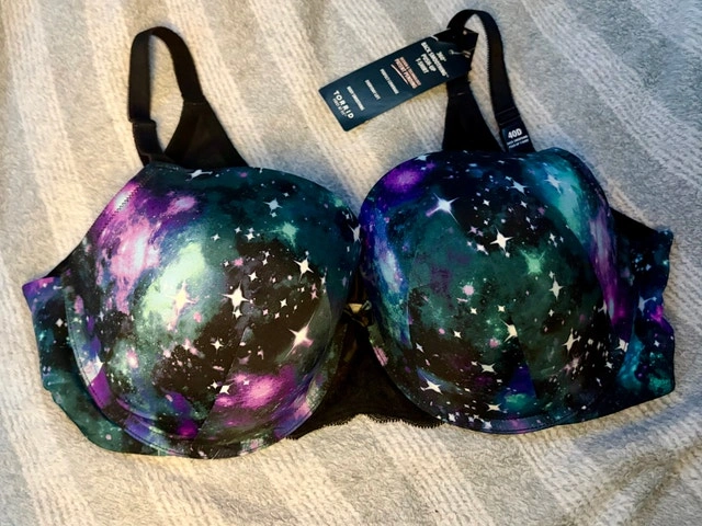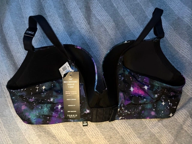 Brand new with tags Torrid 360 push-up t-shirt bra in a size 40D. Features a fun galaxy print. Originally purchased for $68.90. If the ad is up, it's still available!