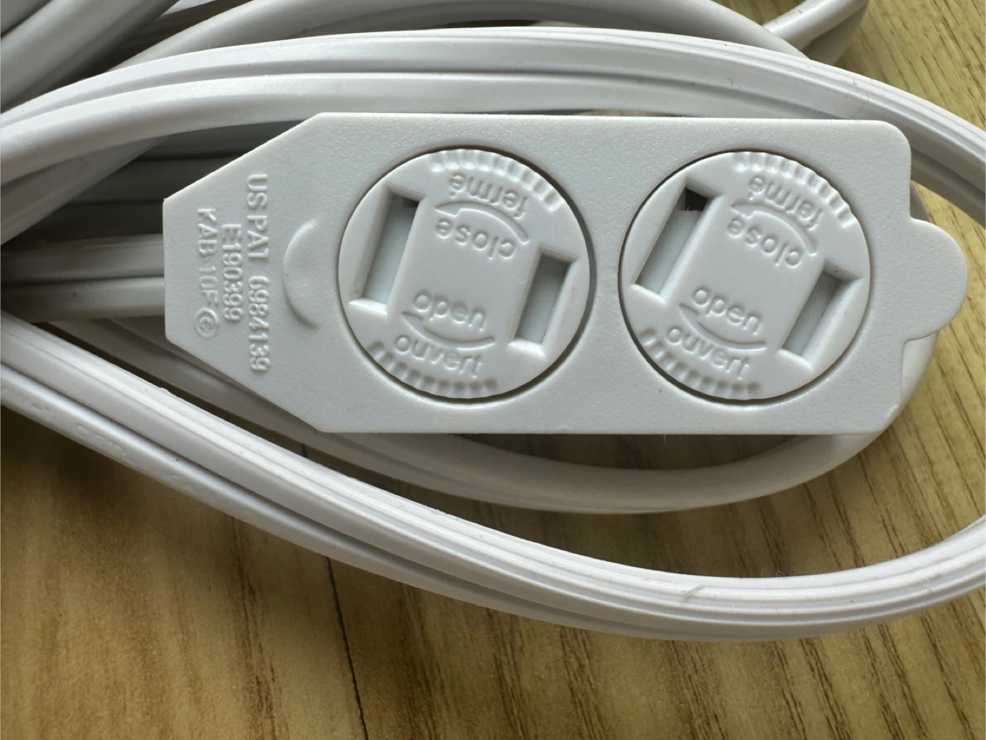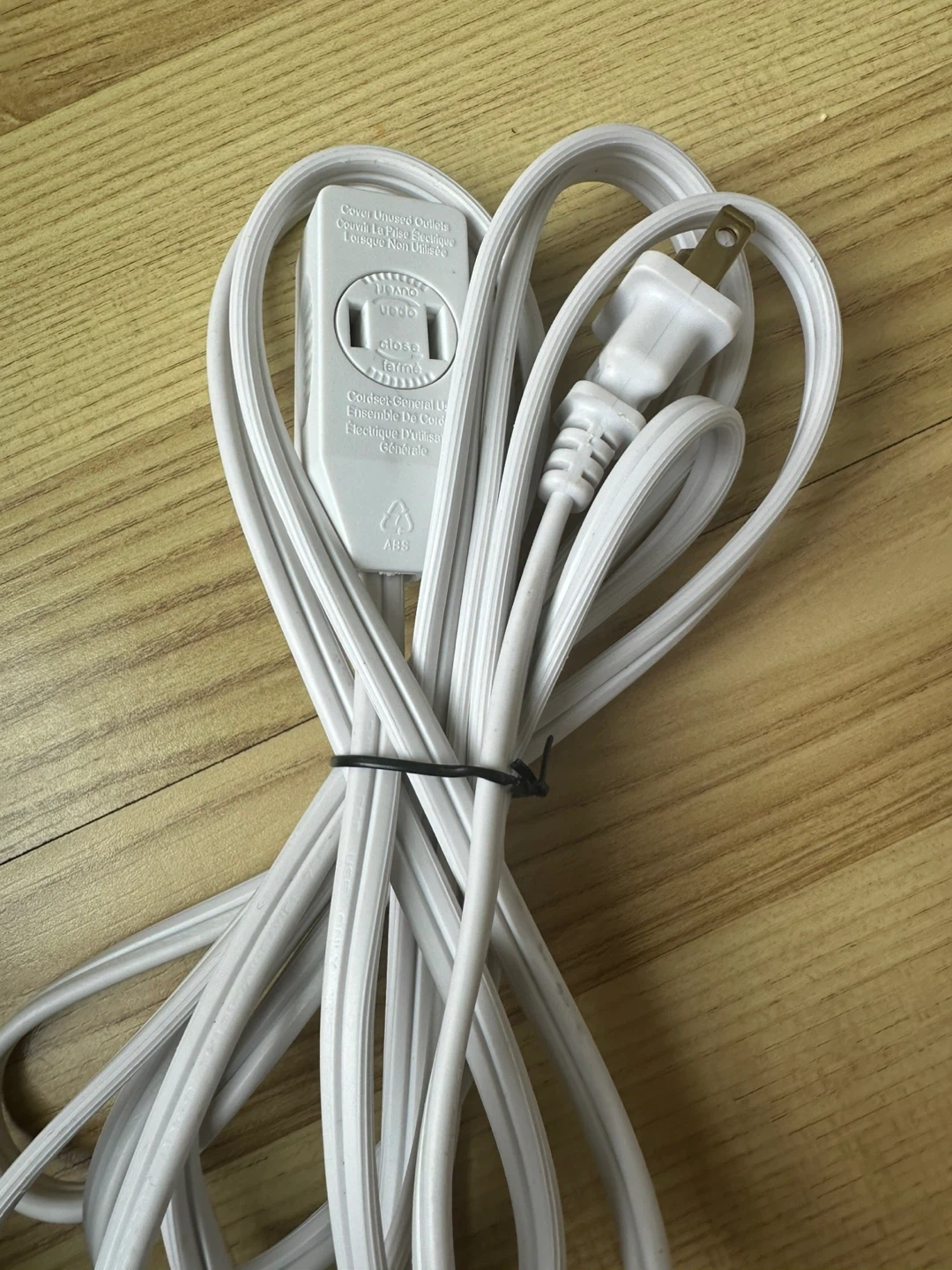This is a white 3 -outlet extension cord. It has 3 polarized outlets. The cord features a built-in shutter system for child safety.