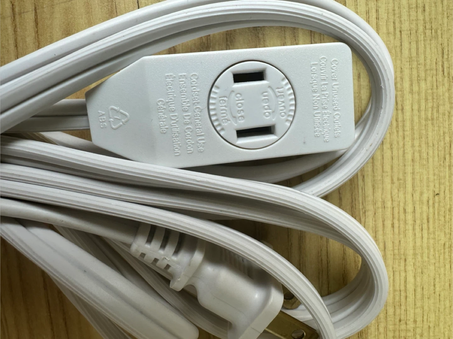 This is a white 3 -outlet extension cord. It has 3 polarized outlets. The cord features a built-in shutter system for child safety.