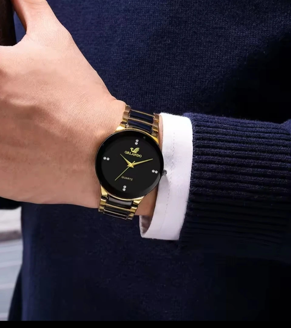 This Orlando quartz watch features a black dial with gold accents and a matching gold-tone band. It's a stylish timepiece for everyday wear. The watch uses a quartz movement for accurate timekeeping.