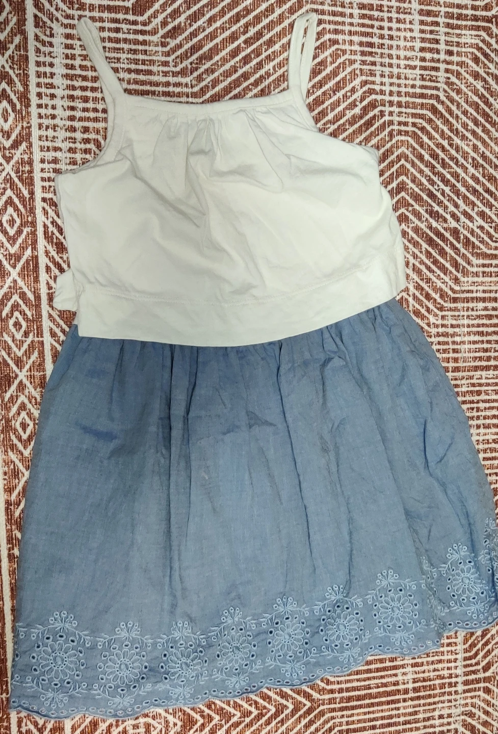 Selling a cute Baby Gap dress! It's a size 3 for toddlers. The top is white and the skirt is a lovely light blue with a pretty floral design at the bottom