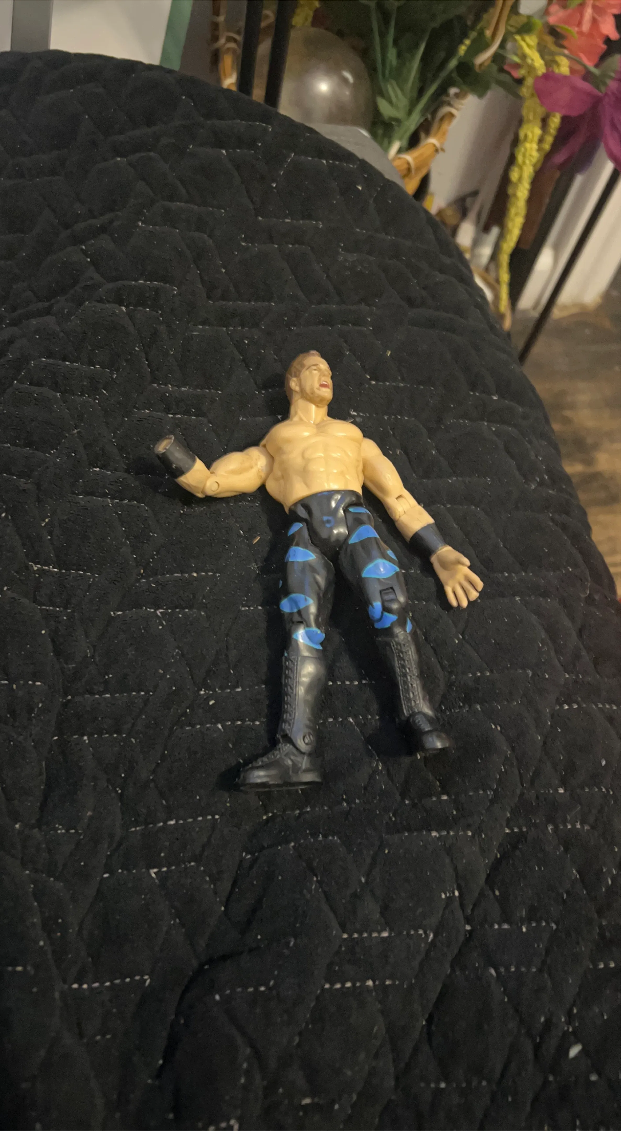 This is a wrestling action figure with blue and black attire. It has articulation at the arms and legs. The figure is approximately 6 inches tall.