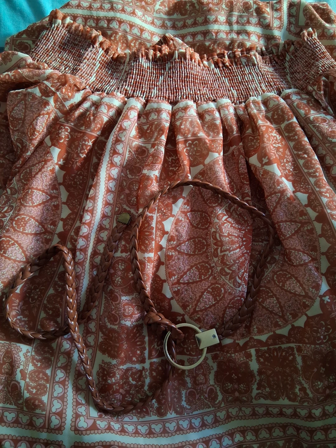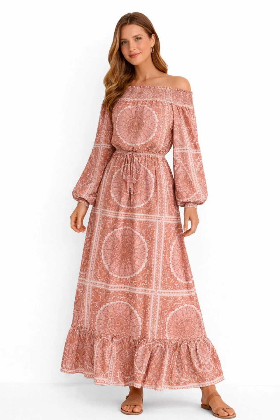 This off-the-shoulder maxi dress features a smocked bodice and a drawstring waist. It's made from a lightweight, flowy fabric with a distressed paisley print. Includes a braided belt.