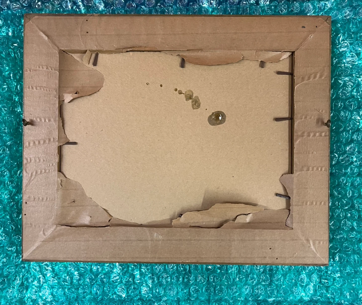 Charming vintage print depicting a rustic cottage scene with figures. It's housed in an ornate, antique-style frame, adding a touch of old-world elegance. This piece would brighten up any wall in your home!