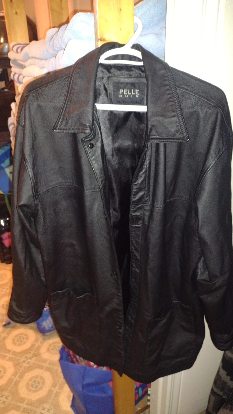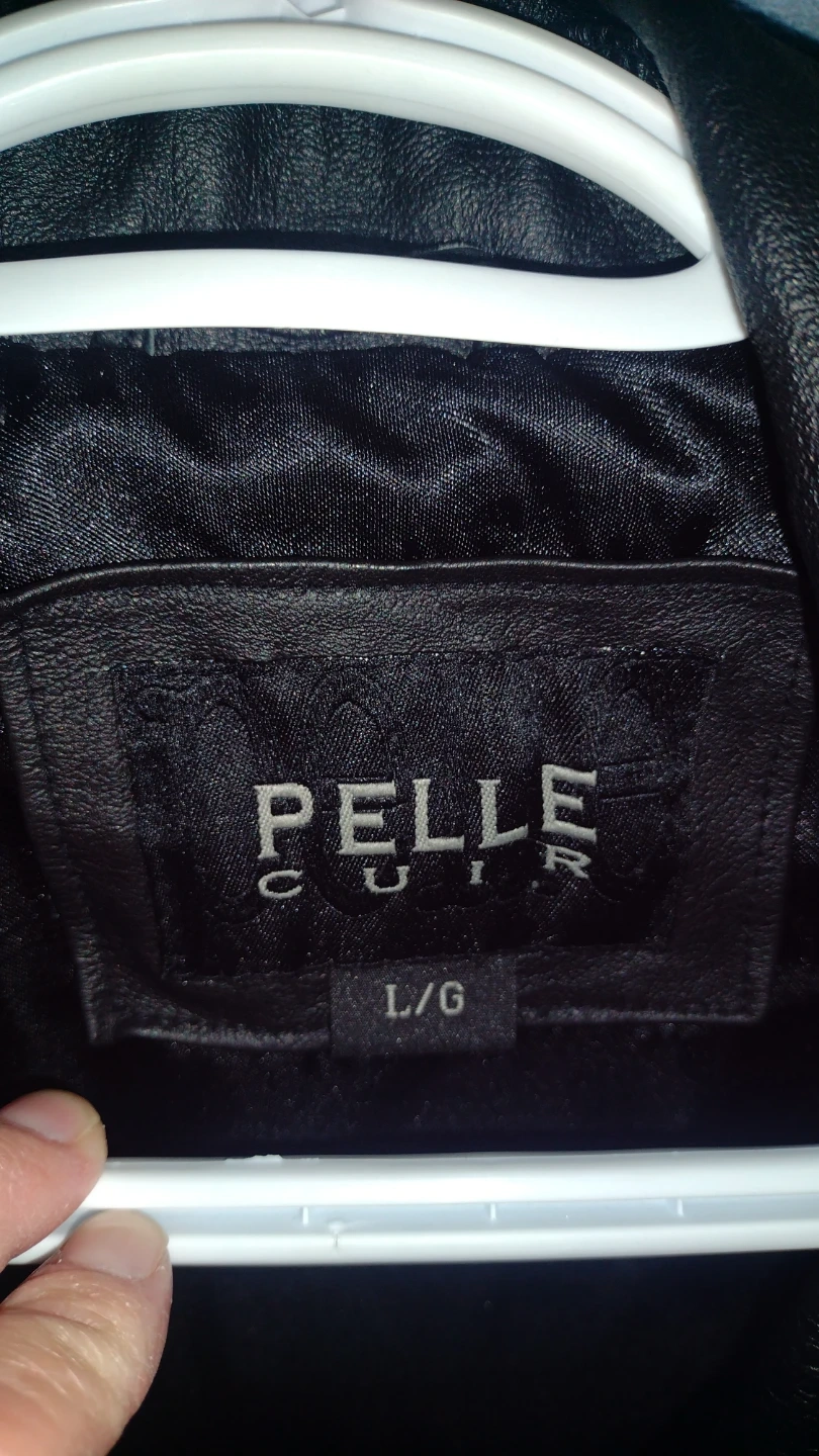 Pelle Cuir black leather jacket. Size is L/G. It's made of leather with a satin lining. Great for cooler weather!