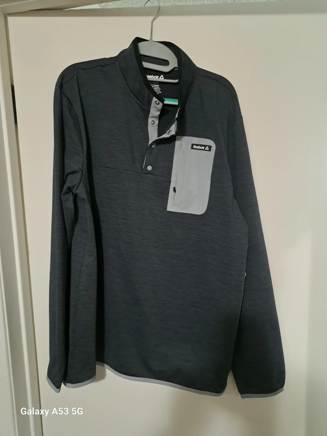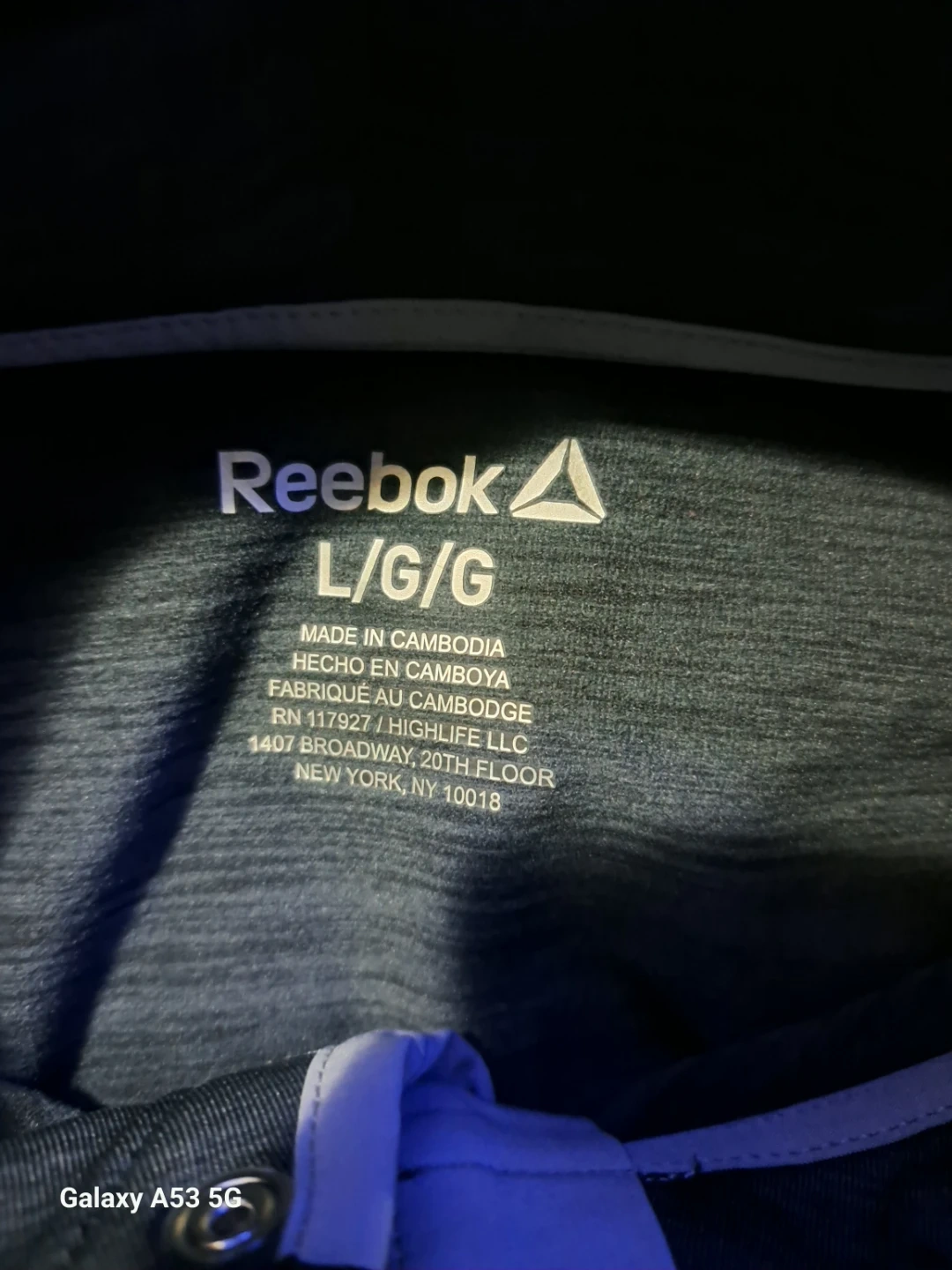 This is a Reebok men's long sleeve shirt with a snap collar. It's a size large (L/G) and features a chest pocket. Made in Cambodia.