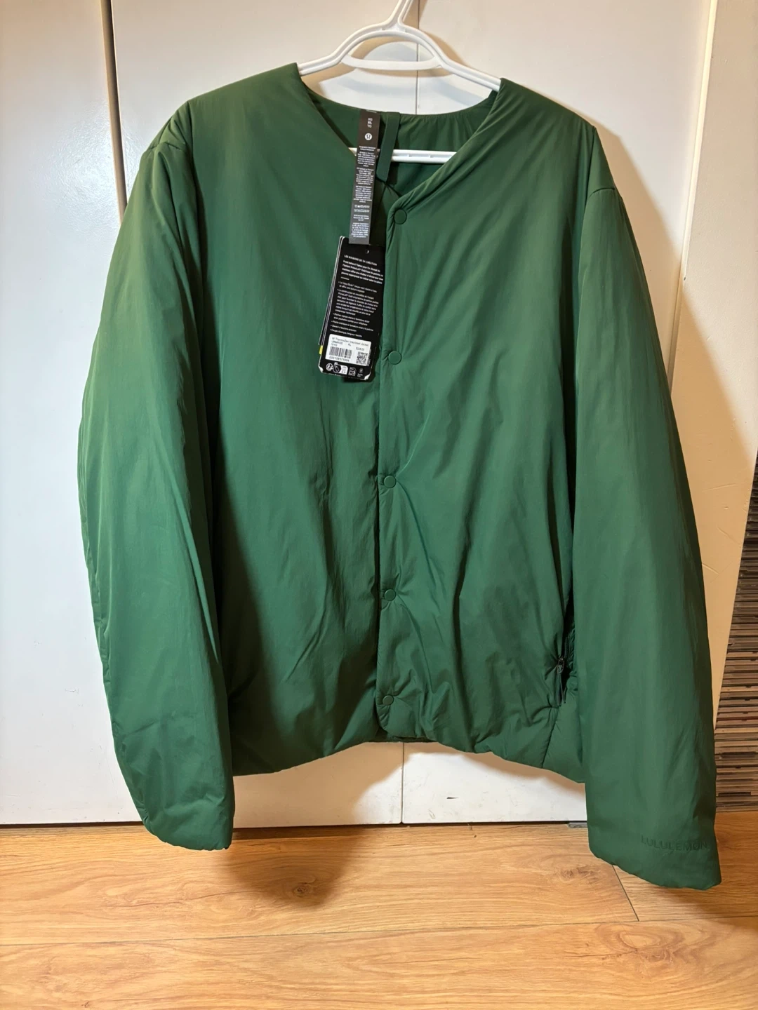 This Lululemon jacket is made with a water-repellent, wind-shedding Glyde fabric and features Primaloft Gold insulation for warmth. It has snap button closures, a classic cut, and a long hem. Pockets include zippered hand pockets with a hidden phone sleeve and an interior chest pocket. It's designed for comfort and warmth in cooler weather.