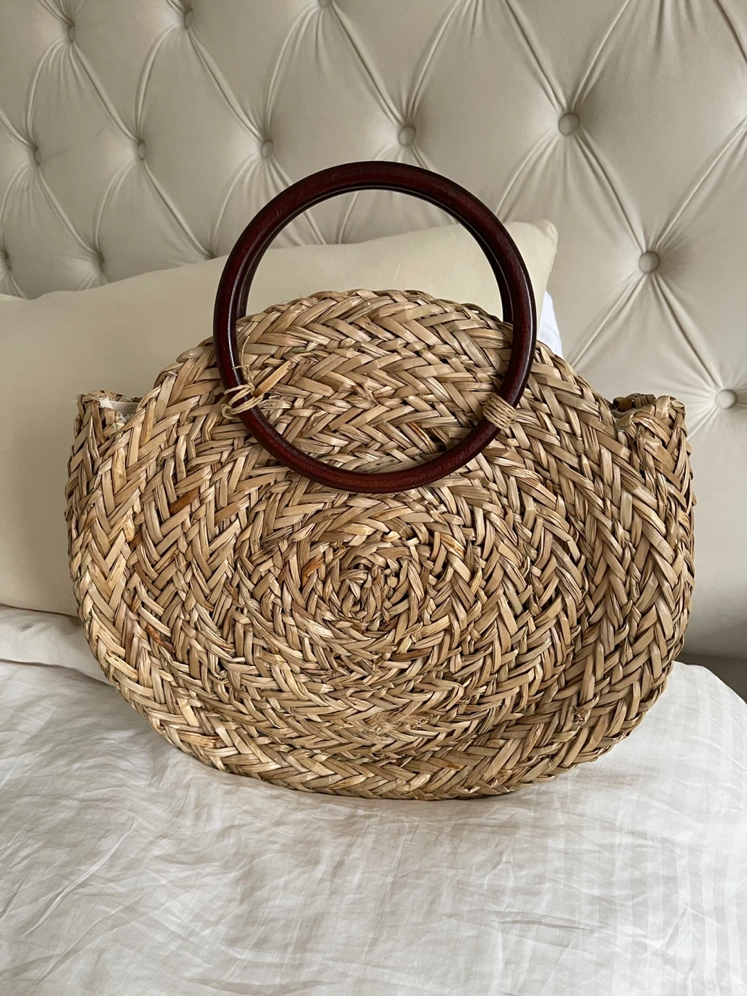 This Auxiliary straw tote bag features a woven design with round wooden handles. It has a fabric lining and an interior pocket. It's a stylish accessory for warmer days!