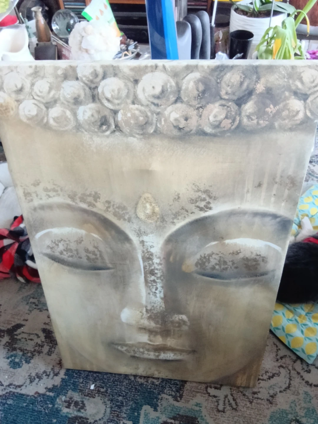 Canvas print featuring a Buddha face. Neutral, earthy tones. Adds a serene touch to your space. Ready to hang.