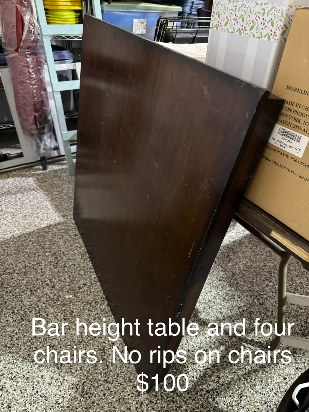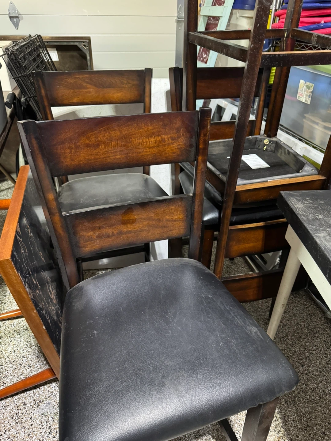 This set includes a dark wood bar height table and four matching chairs. The chair seats are upholstered in black, and there are no rips on them. It's a great set for a kitchen or dining area.