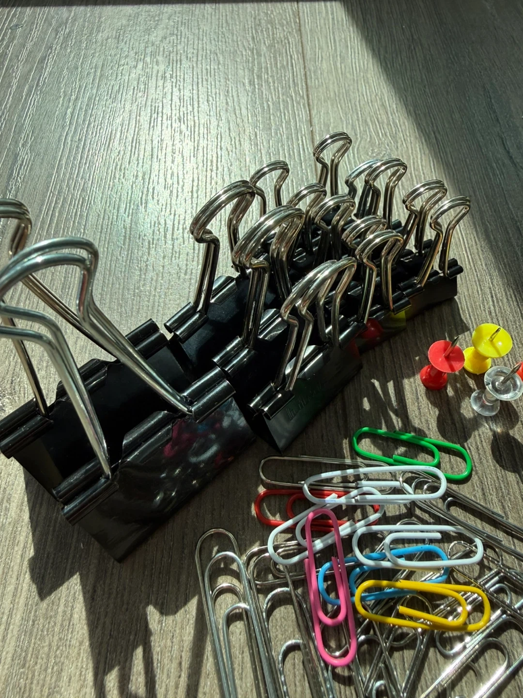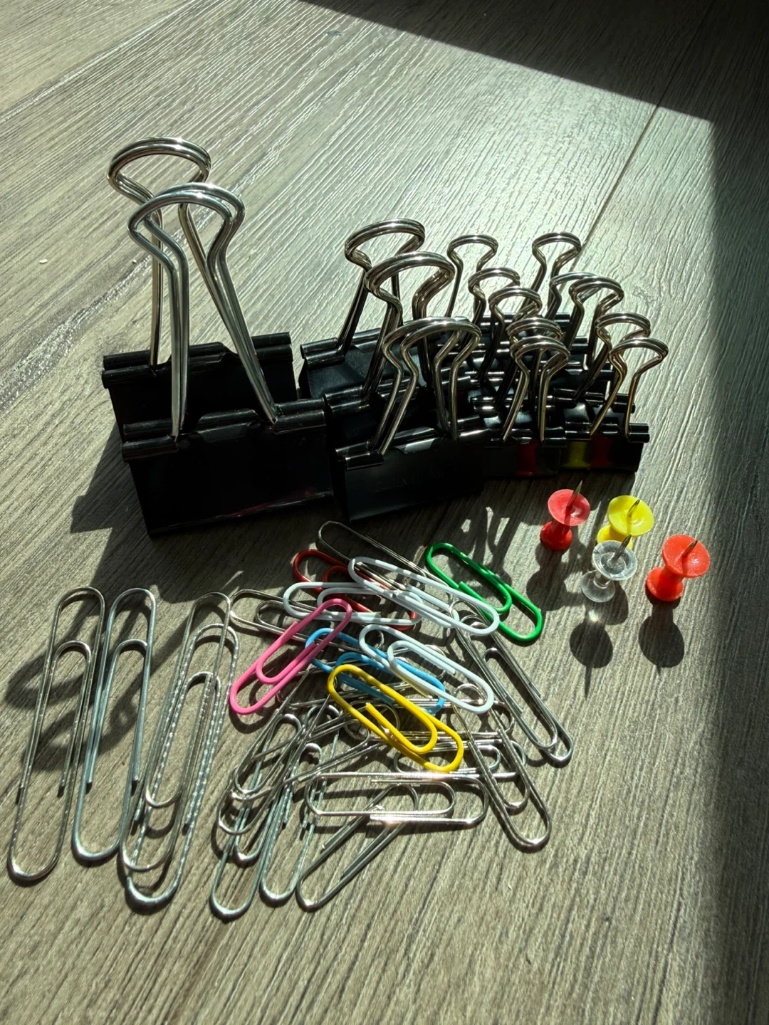 You'll find several black binder clips, a collection of colourful and silver paper clips, and assorted thumbtacks.