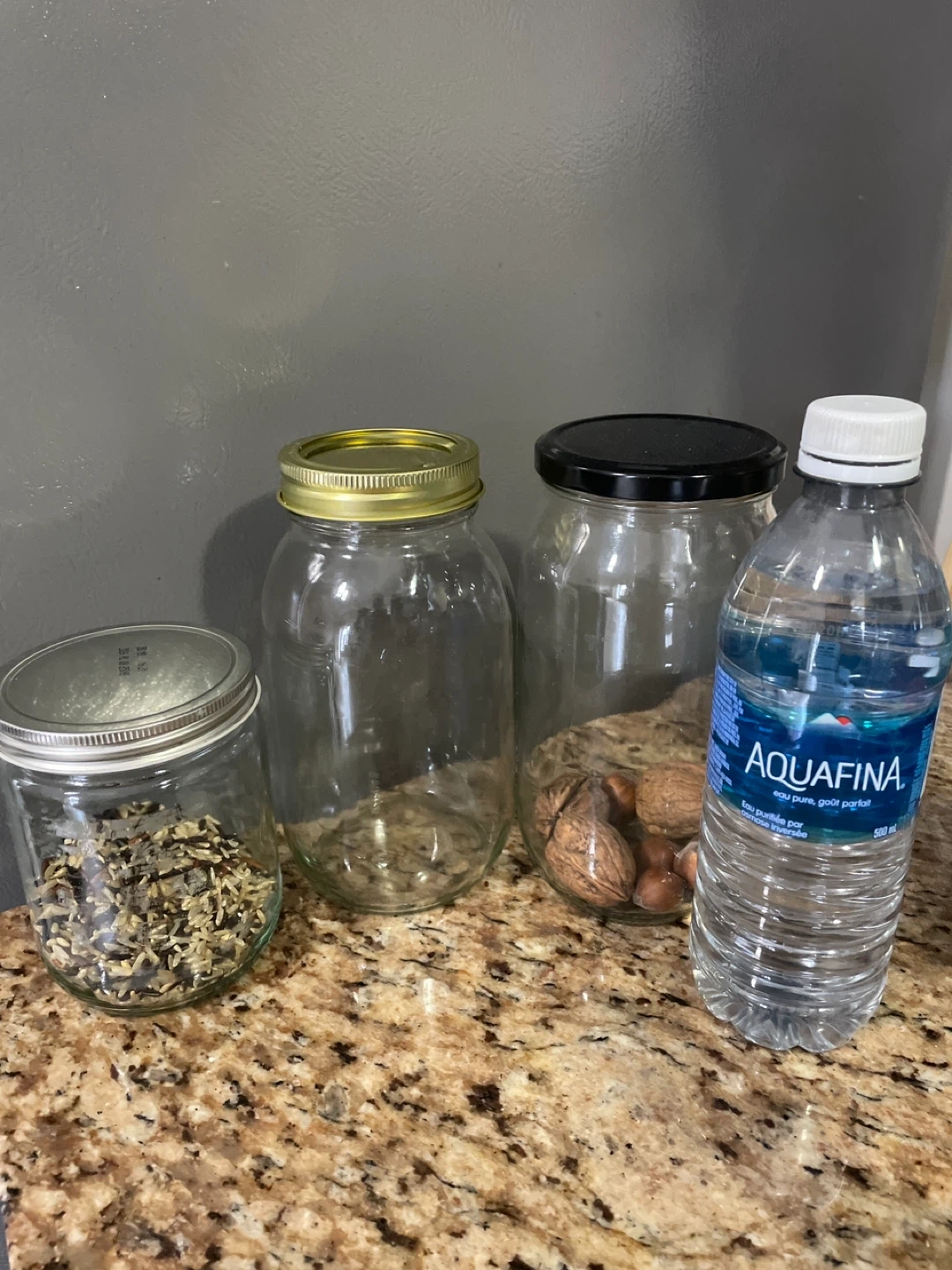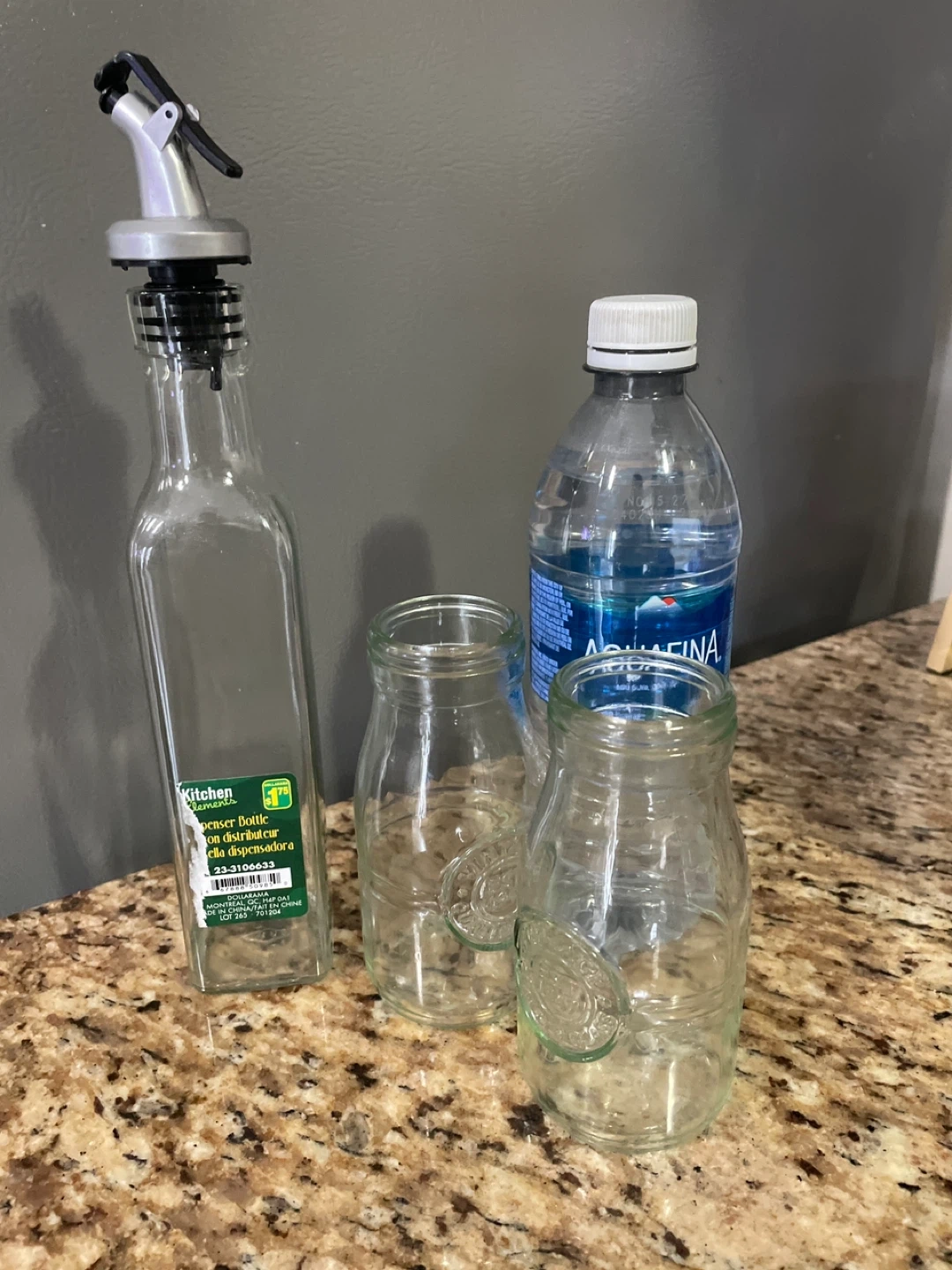 Includes several glass jars with different lids, a Kitchen Basics oil dispenser bottle. Perfect for pantry organization and storing dry goods. Jars are made of glass and come in various sizes.