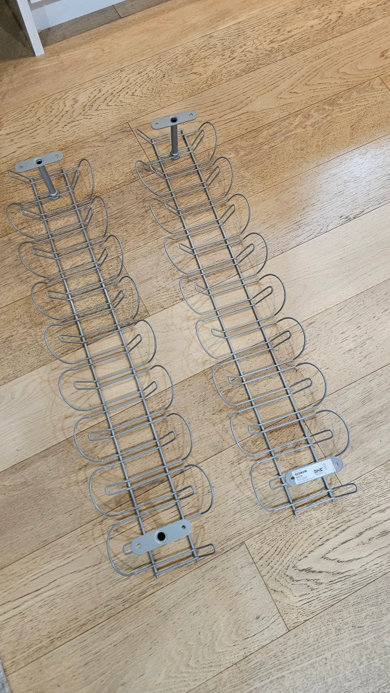 Pair of metal cable organizers for under desk. Grey colour. Excellent for managing cords and cables for computers, montrose and other tech accessories.
