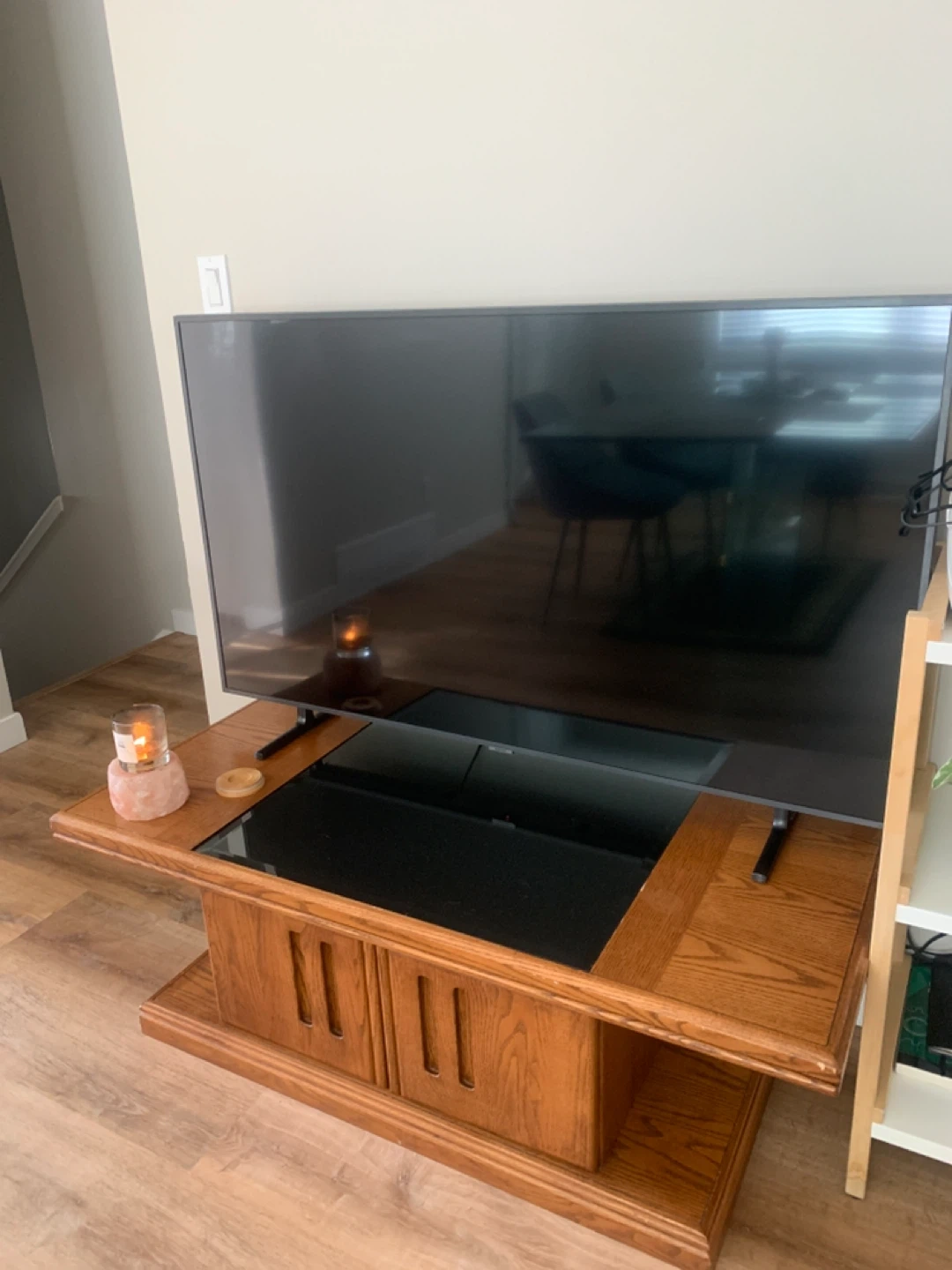 This is perfect as an end table or a coffee table w/ replaceable & removable glass top. The table features a wood frame and a convenient magazine rack built on the sides. All have storage cabinet at the bottom. Glass has small chip as shown in picture but unnoticeable & doesn’t affect function. This is a used table, but it is still in good condition. Don't miss your chance to bring this lovely piece home!