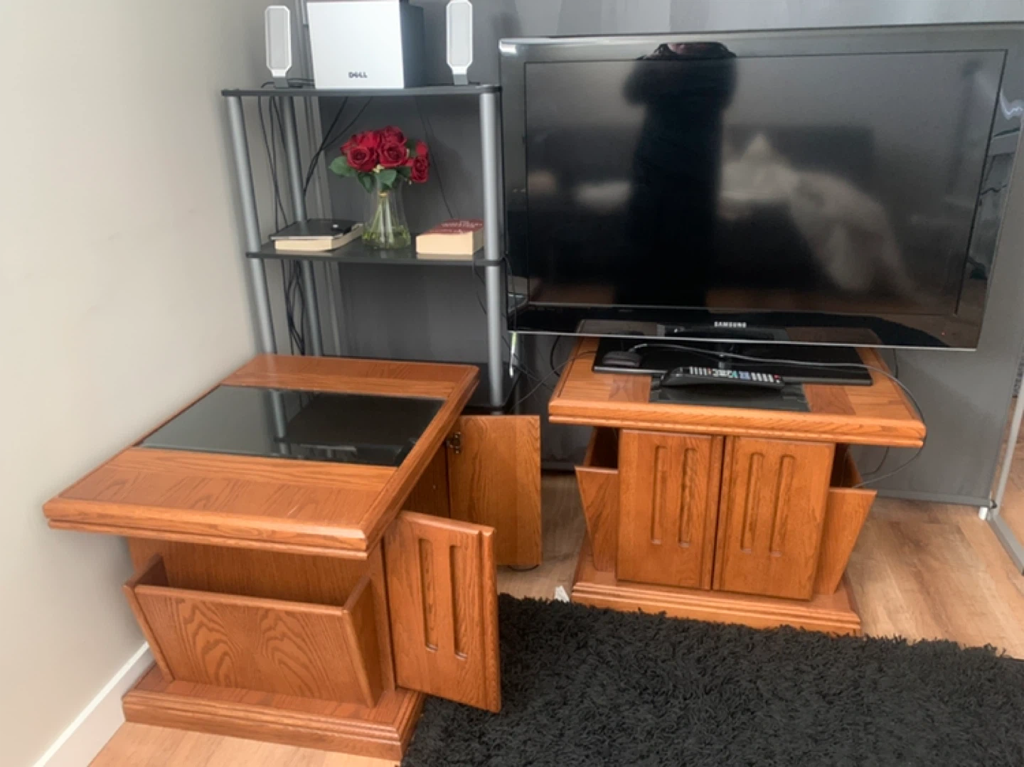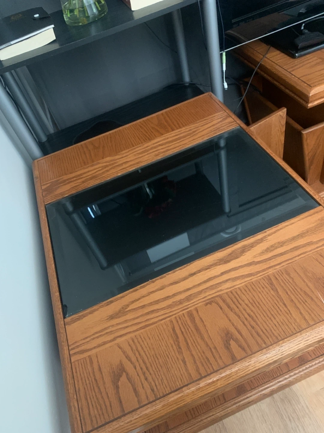 This is perfect as an end table or a coffee table w/ replaceable & removable glass top. The table features a wood frame and a convenient magazine rack built on the sides. All have storage cabinet at the bottom. Glass has small chip as shown in picture but unnoticeable & doesn’t affect function. This is a used table, but it is still in good condition. Don't miss your chance to bring this lovely piece home!