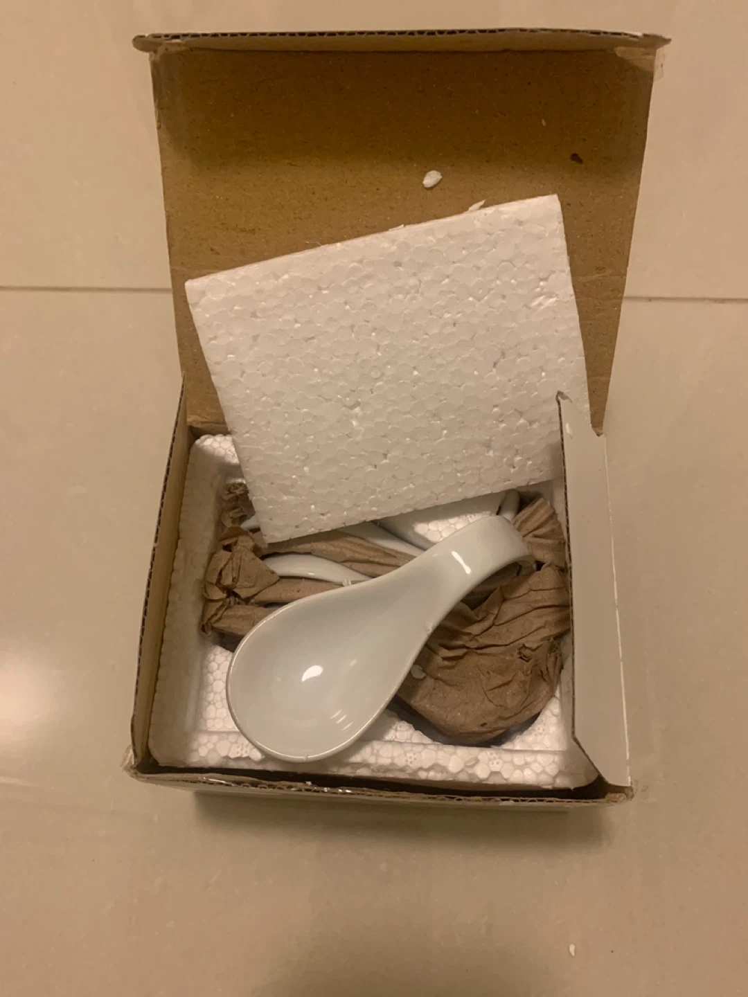 Set of four white ceramic soup spoons. They're made of durable ceramic. Perfect for enjoying your favourite soups and broths!