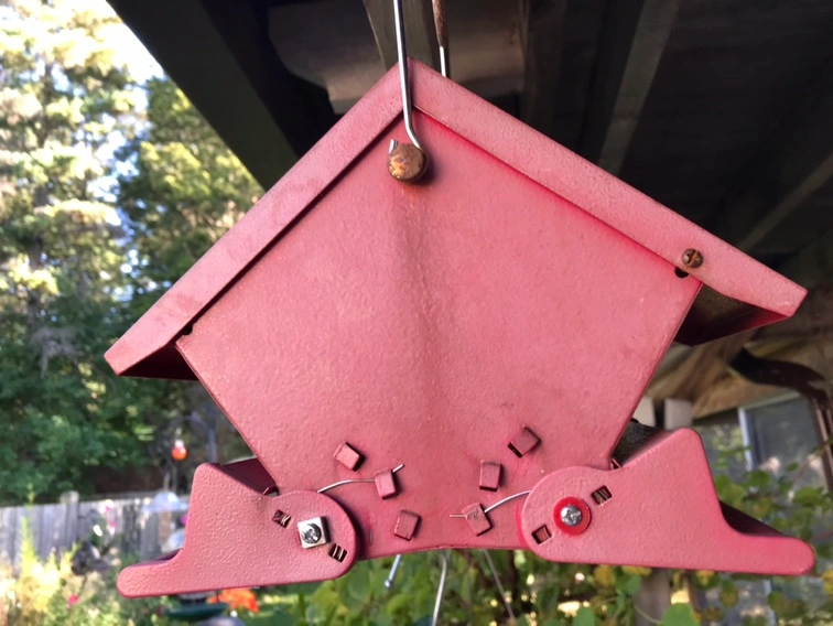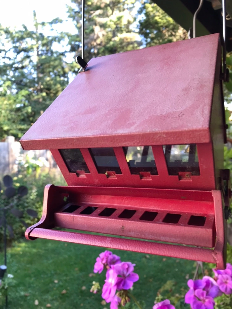 Red squirrel-proof bird feeder that can be hung from a hook. The feeder has a locking top, a waste seed saver baffle, and is made of powder-coated steel. It is designed to keep squirrels out while attracting birds. Colour is faded. Some rust spots but still in good working condition