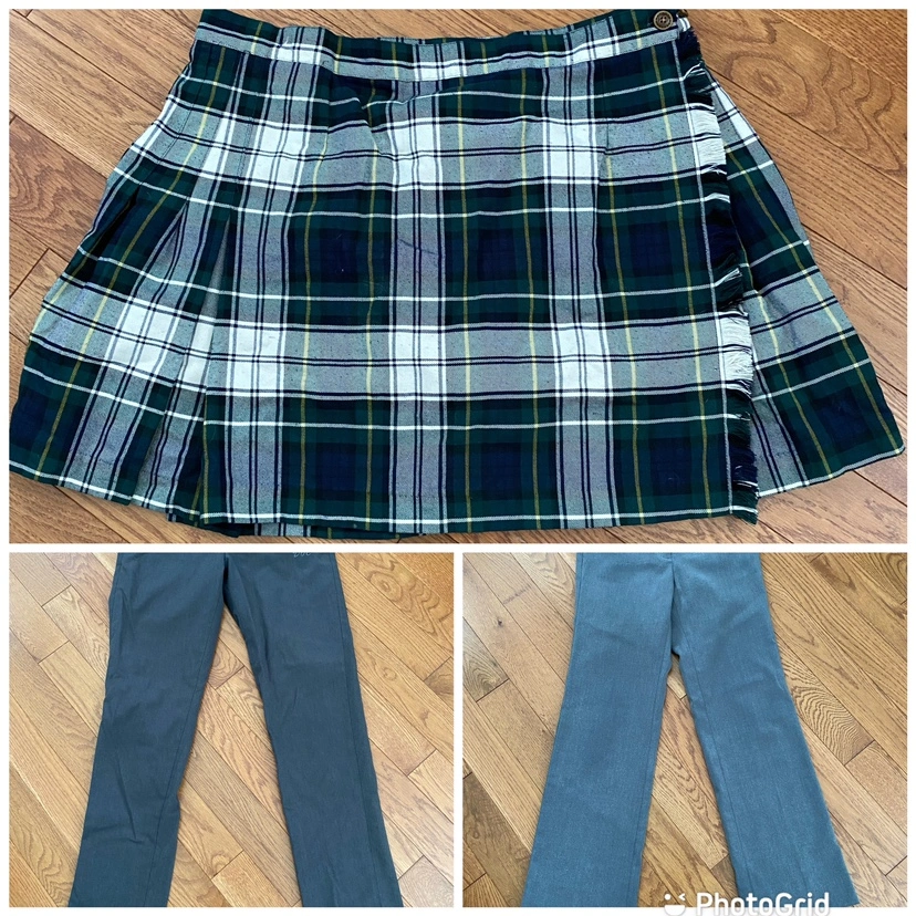 2 plaid skirts and two pairs of grey pants. All in very good condition.
