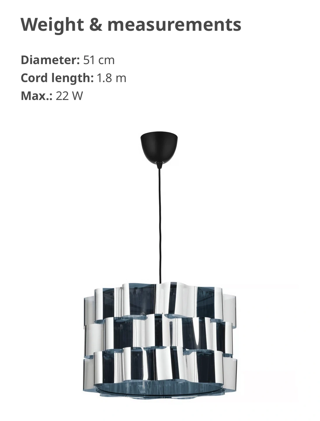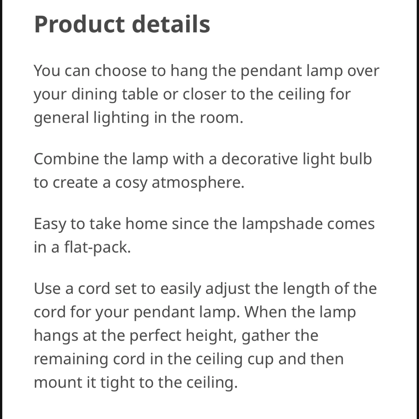 Selling an IKEA ÄLVSTARR / SUNNEBY pendant lamp. It's easy to take home since the lampshade comes in a flat-pack. You can adjust the cord length easily. Combine the lamp with a decorative light bulb to create a cosy atmosphere