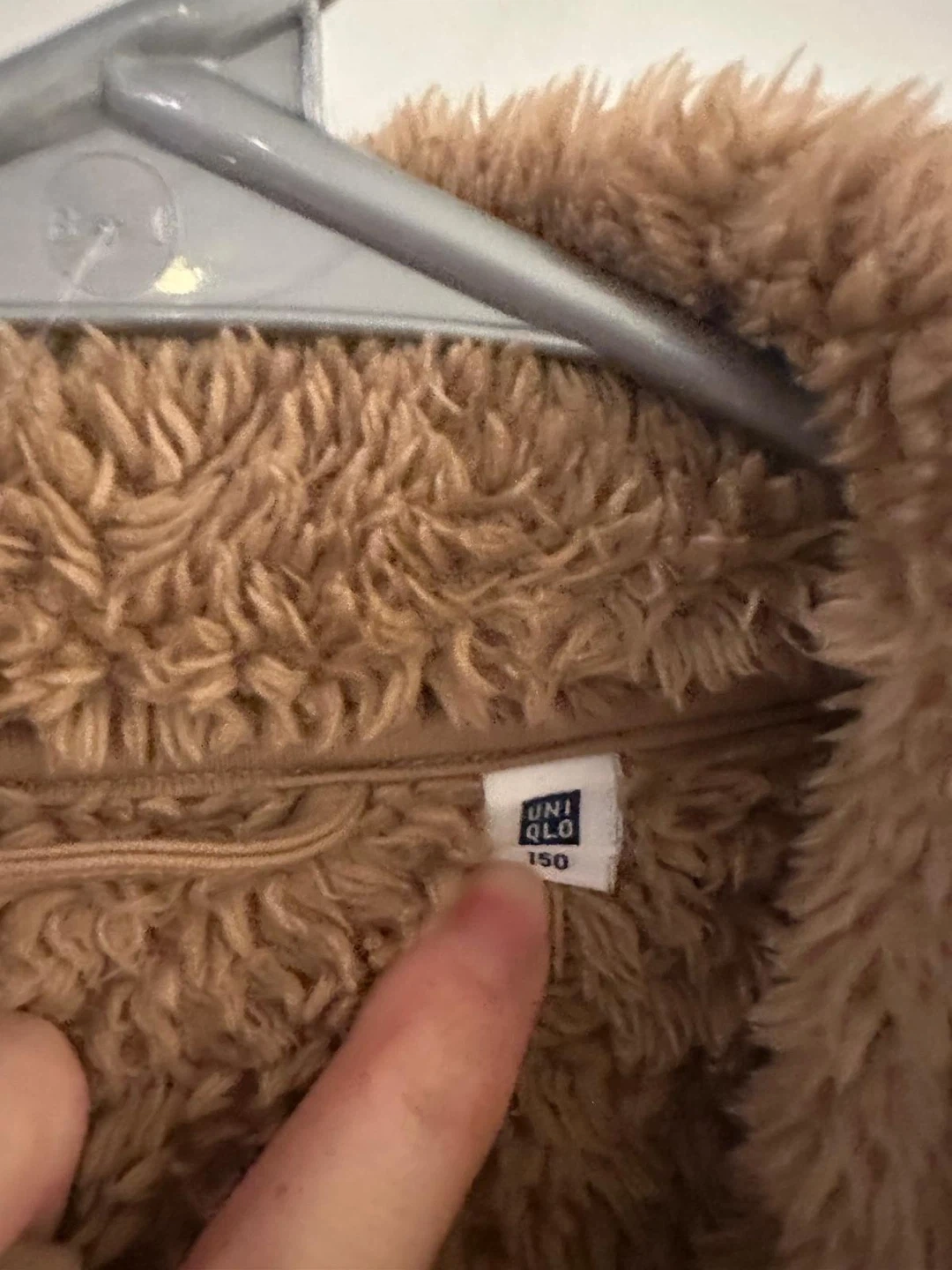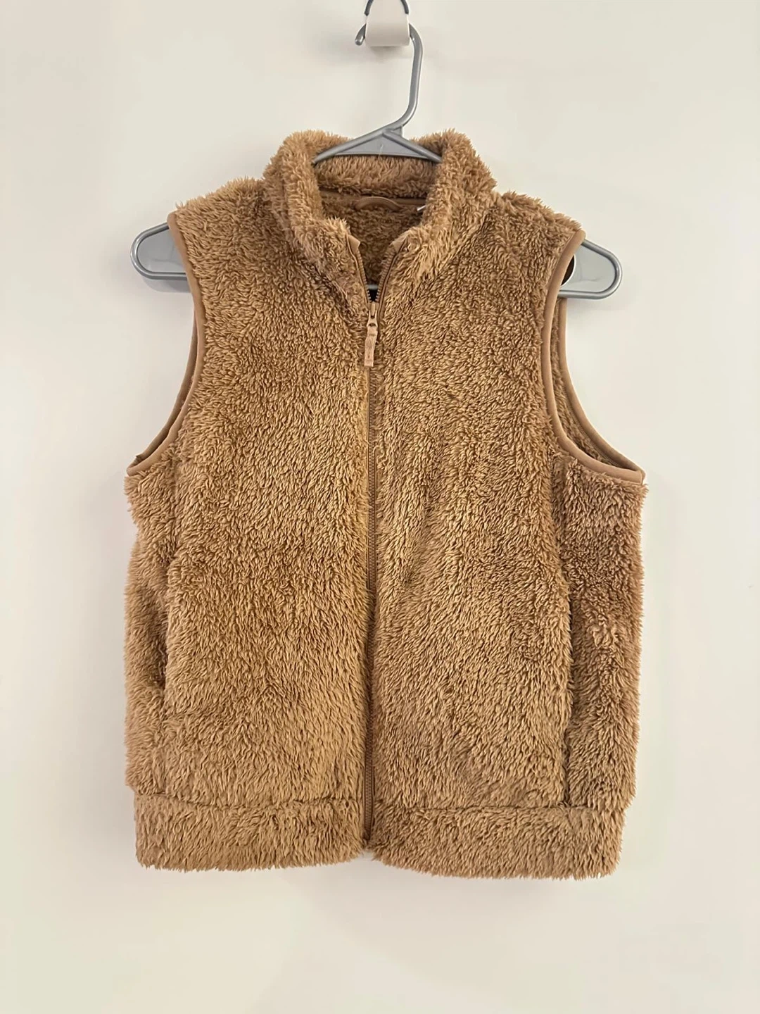 This is a fuzzy brown fleece vest from Uniqlo. It's a size 150 and zips up the front. Perfect for layering on cooler days!