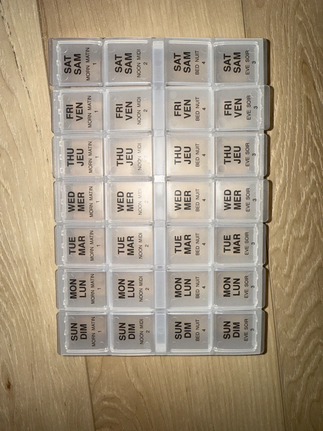 This is a pill organizer with compartments for each day of the week, divided into morning, noon, evening, and bedtime. It's perfect for keeping your medication organized!