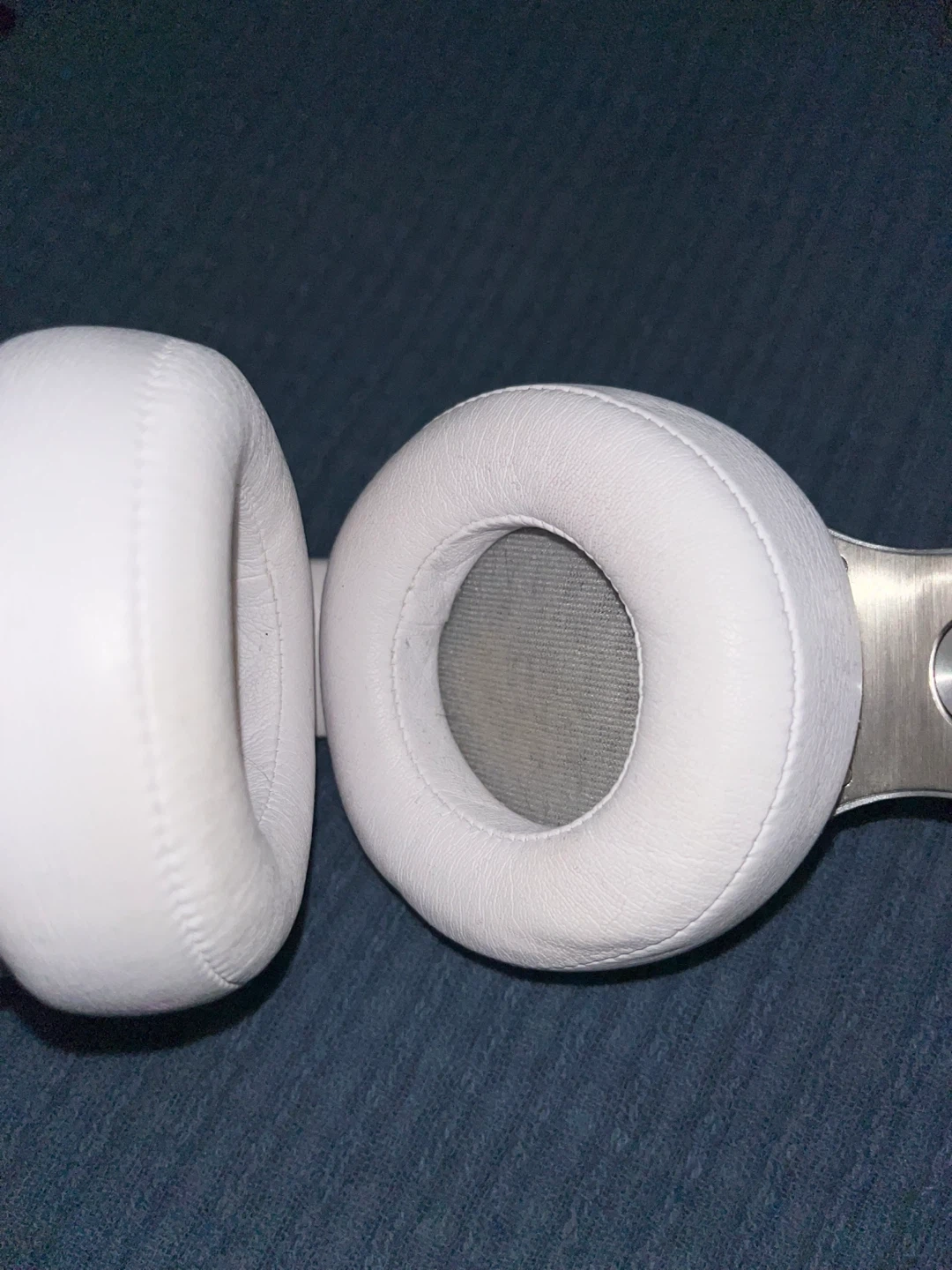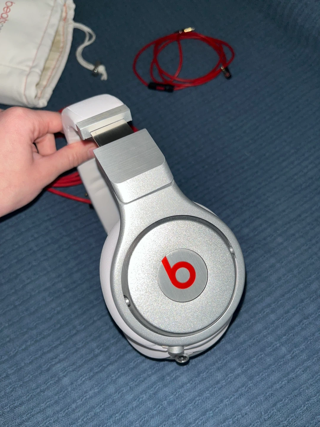 Over-ear headphones in white with silver accents. It comes with a carrying pouch and two red audio cables. These headphones are perfect for music enthusiasts who want a premium listening experience. Like new condition, very rare
