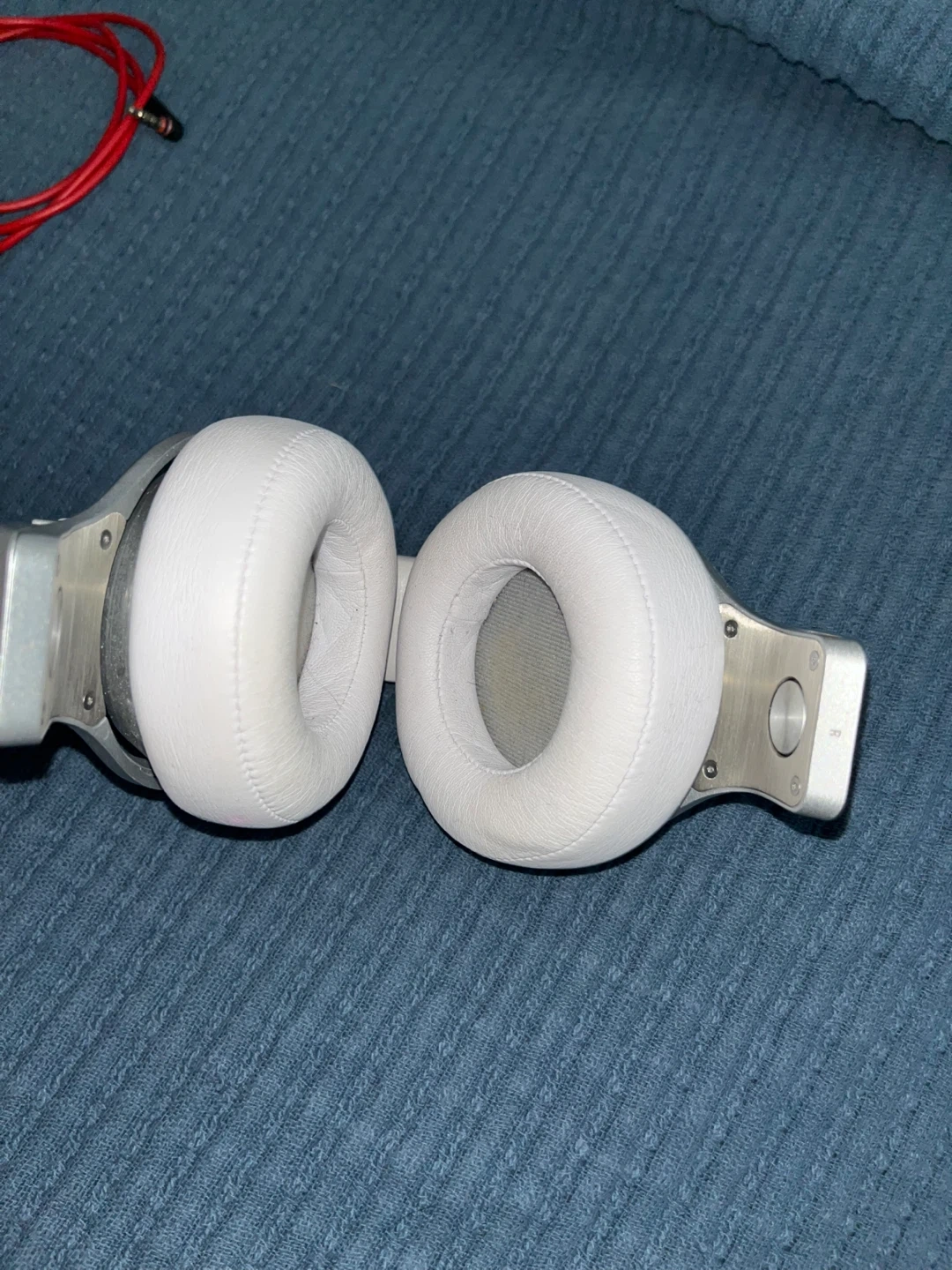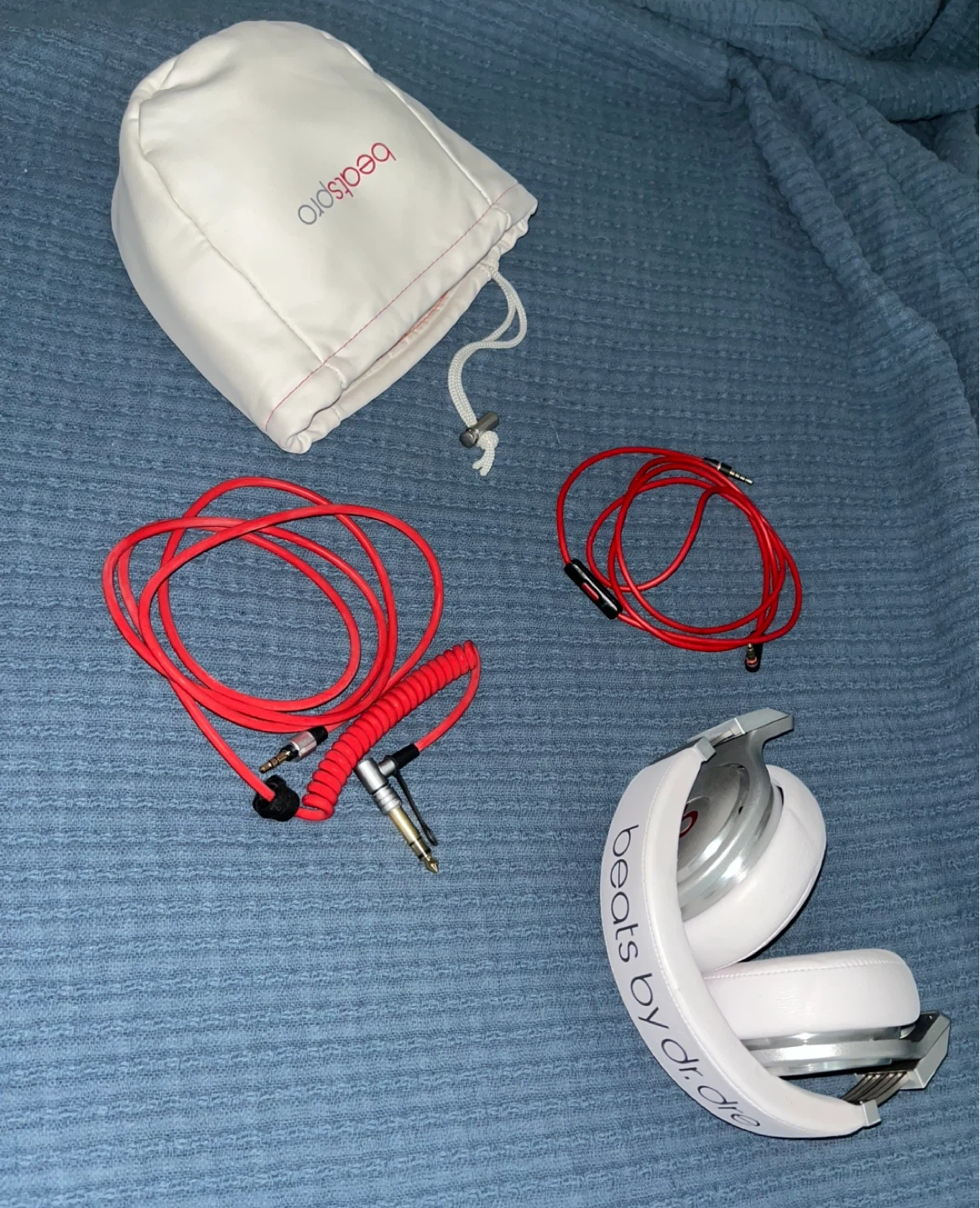 Over-ear headphones in white with silver accents. It comes with a carrying pouch and two red audio cables. These headphones are perfect for music enthusiasts who want a premium listening experience. Like new condition, very rare