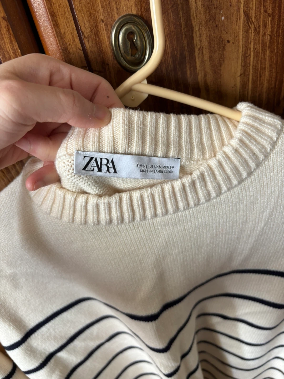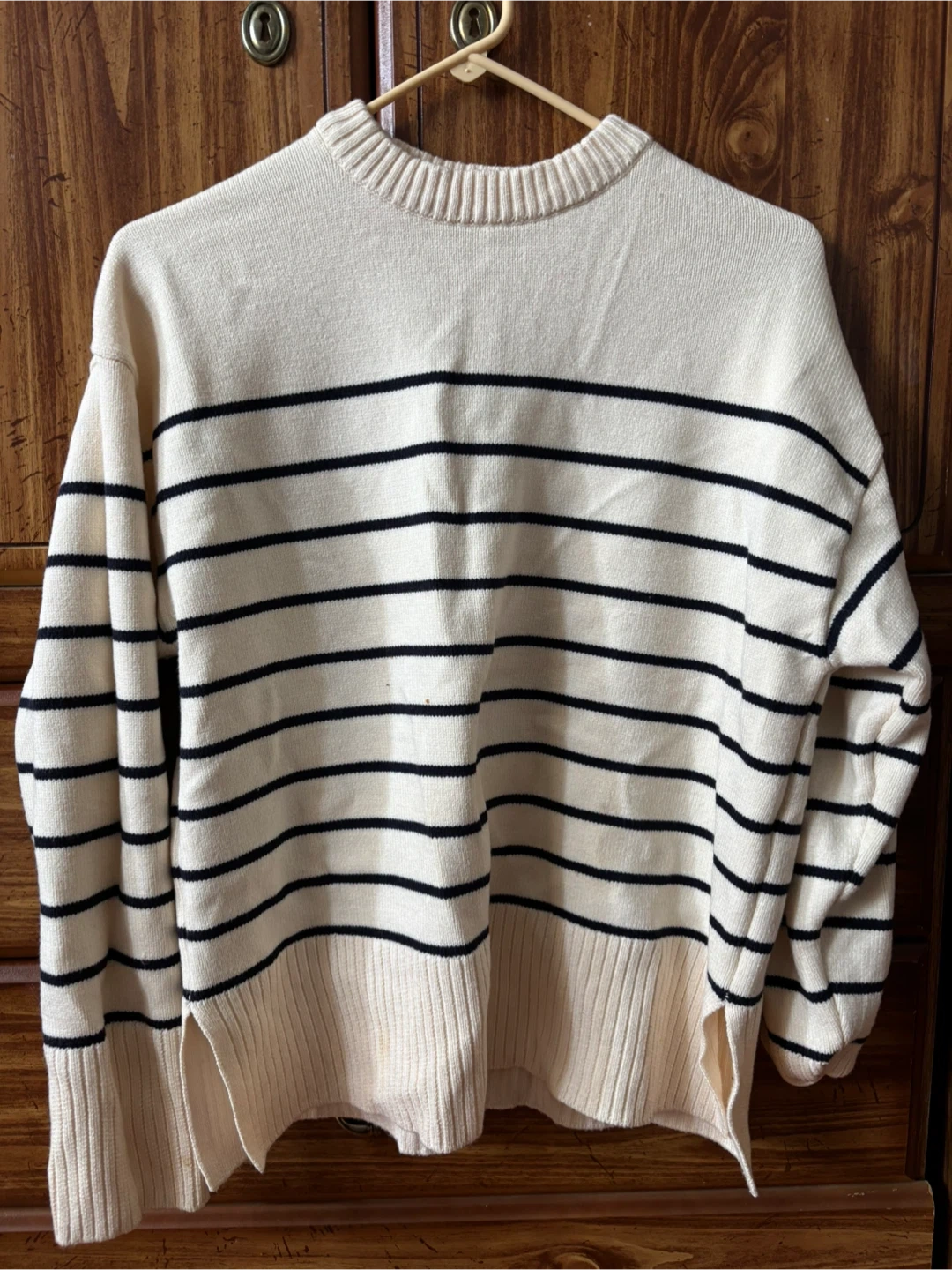 Classic cream and black striped sweater from ZARA. It's a relaxed fit with ribbed cuffs and hem. Perfect for layering or wearing on its own for a casual look!