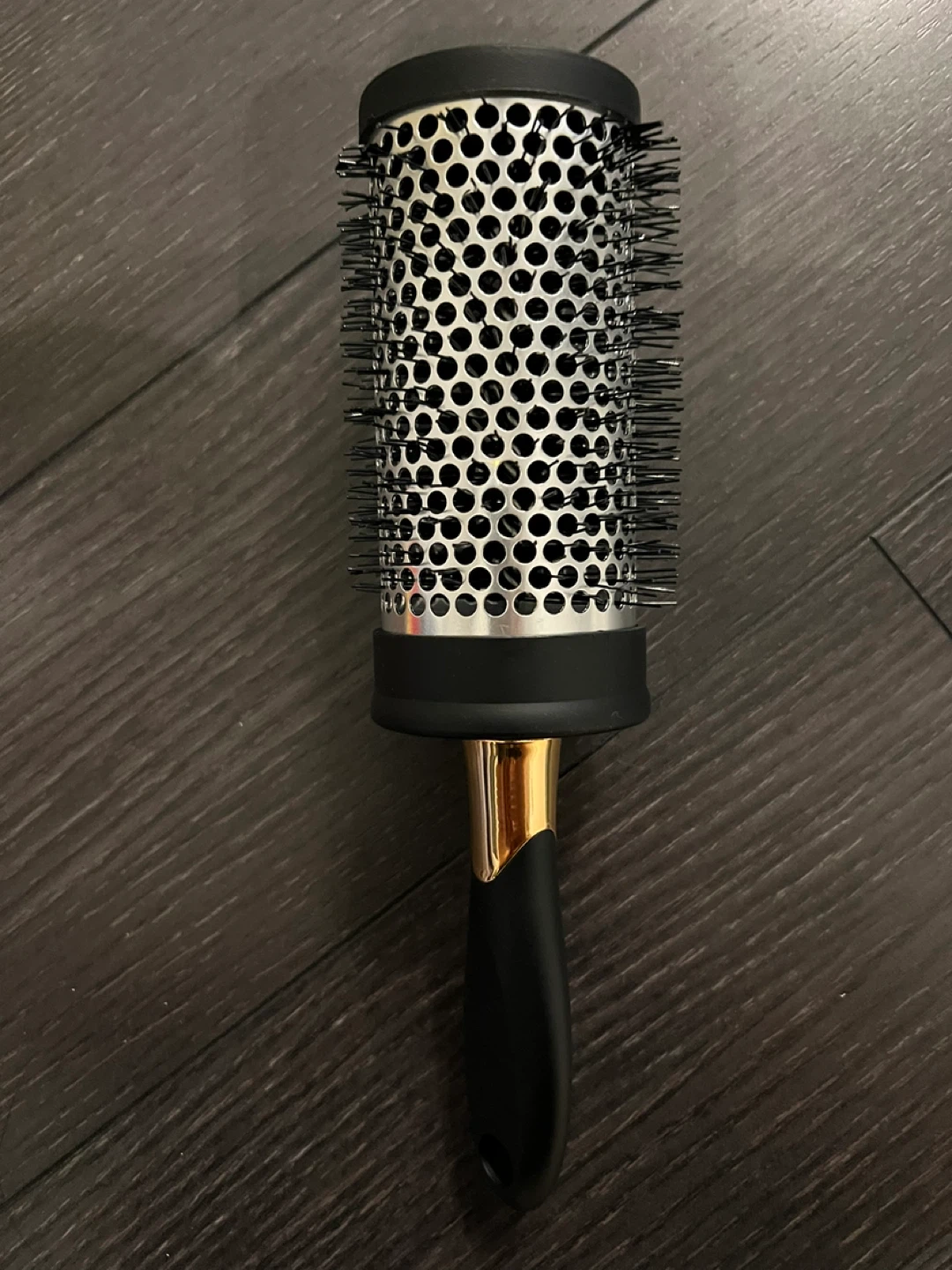 Selling a round hair brush with a silver barrel, black bristles, and a black and gold handle. It's new and ready to help you achieve your best hair styles.