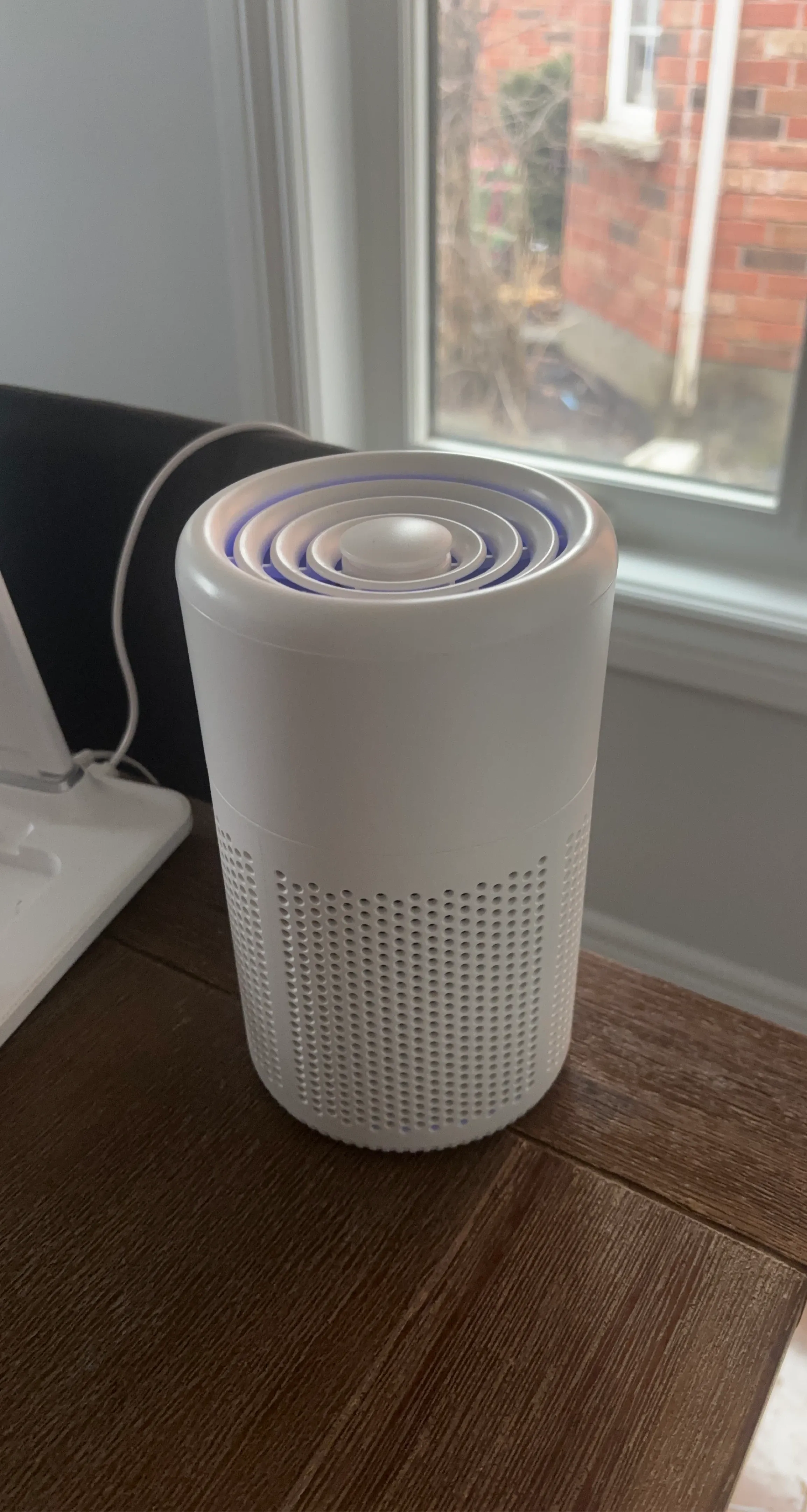 This white portable air purifier has a cylindrical design with a perforated base for airflow. It's compact and easy to place on a desk or table. Ideal for small spaces!