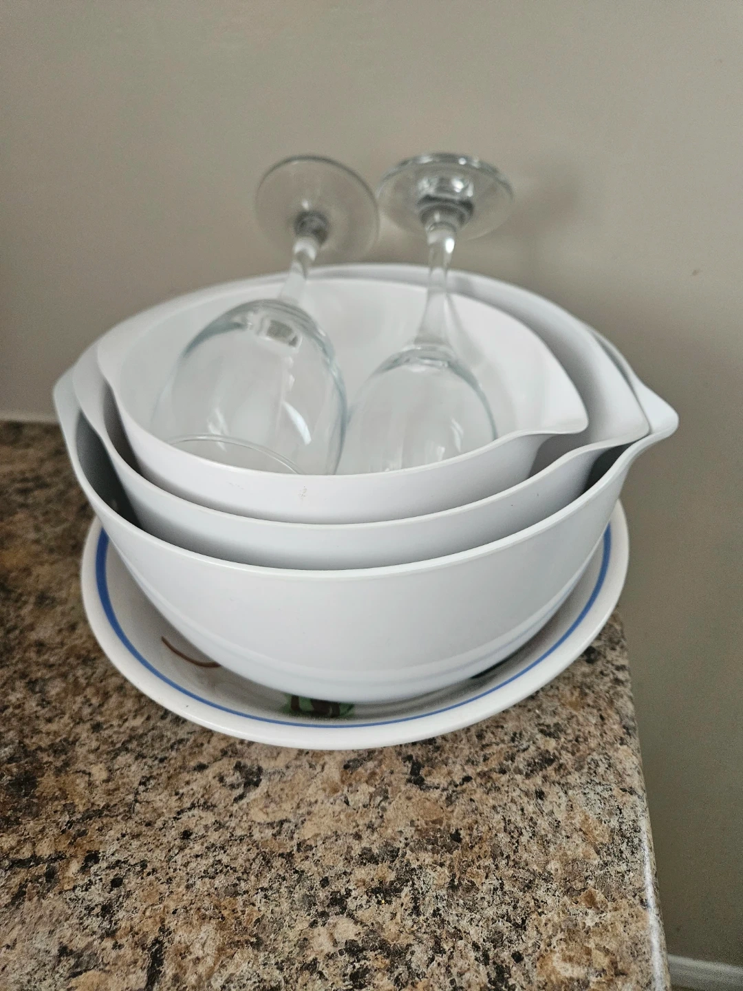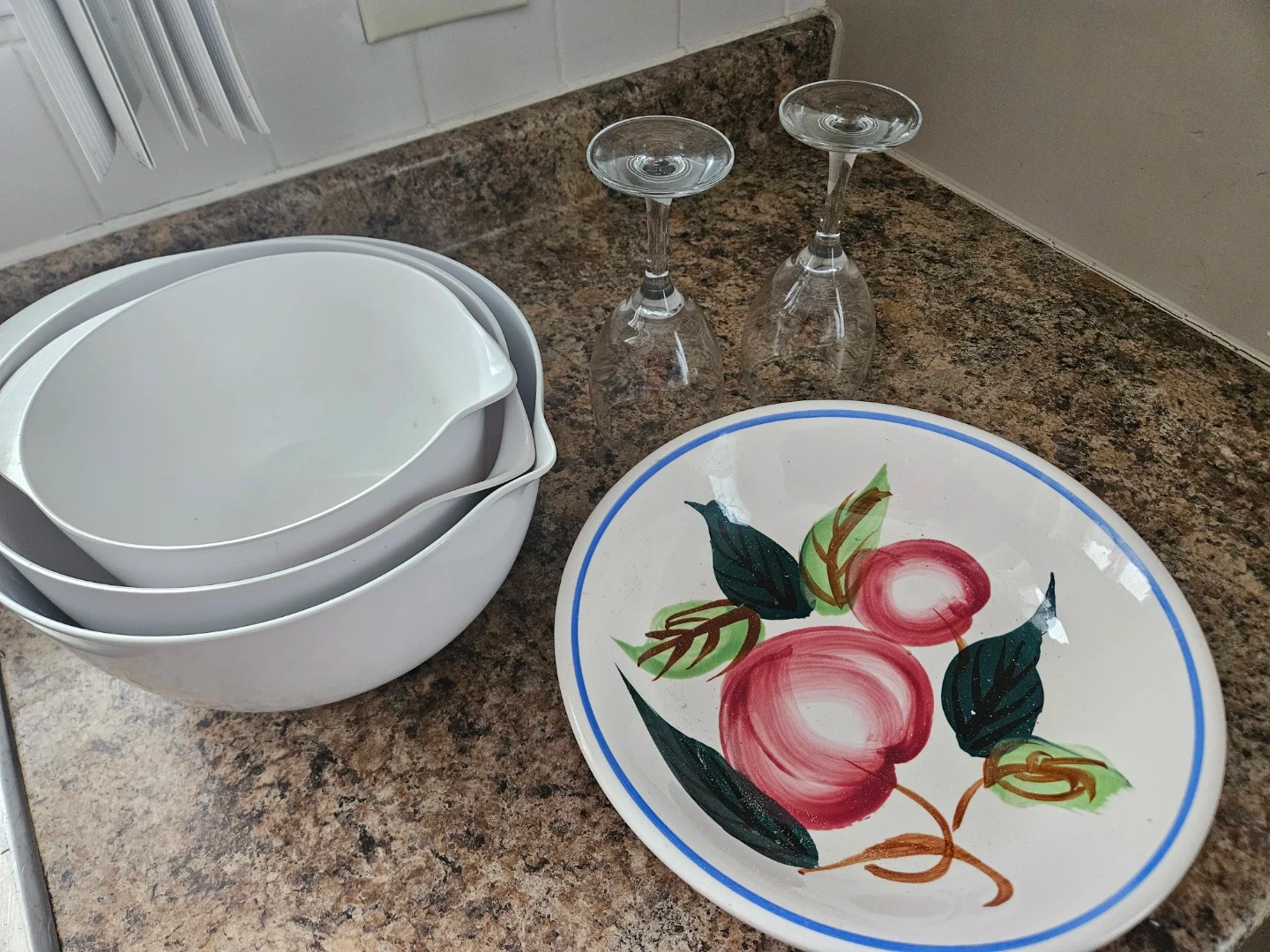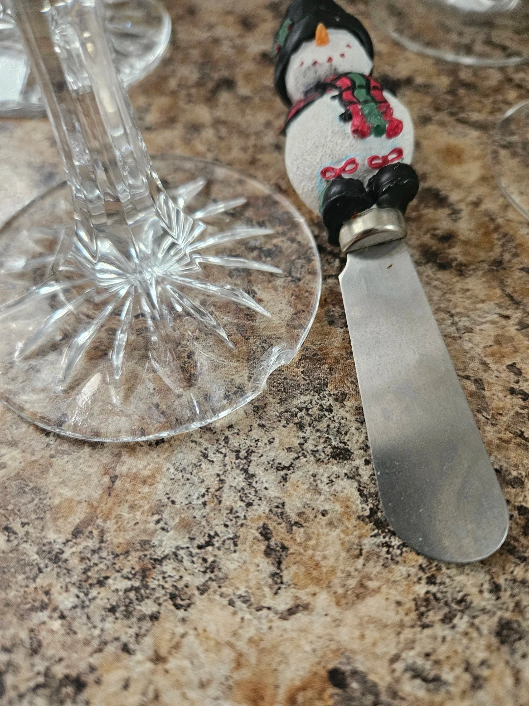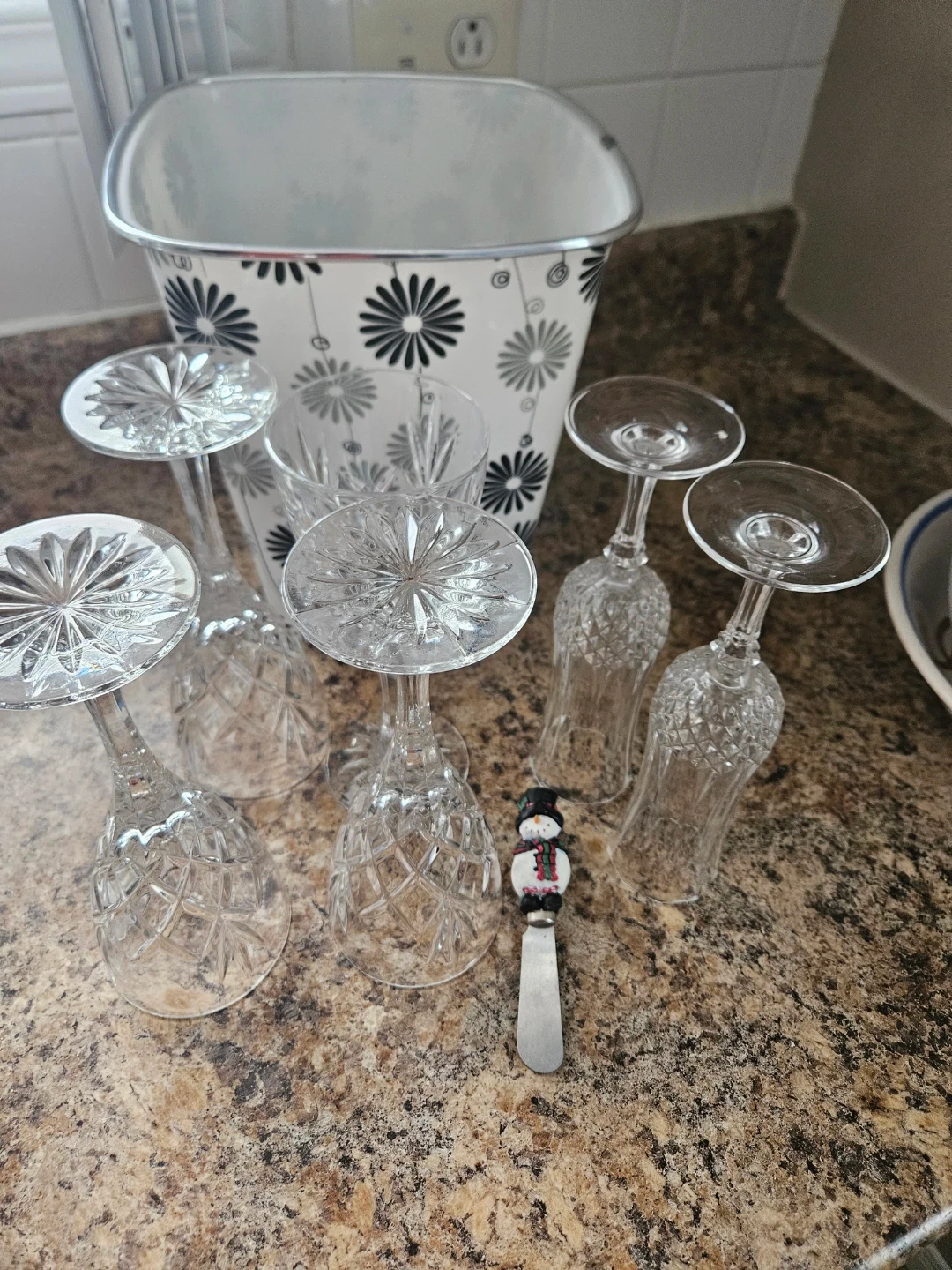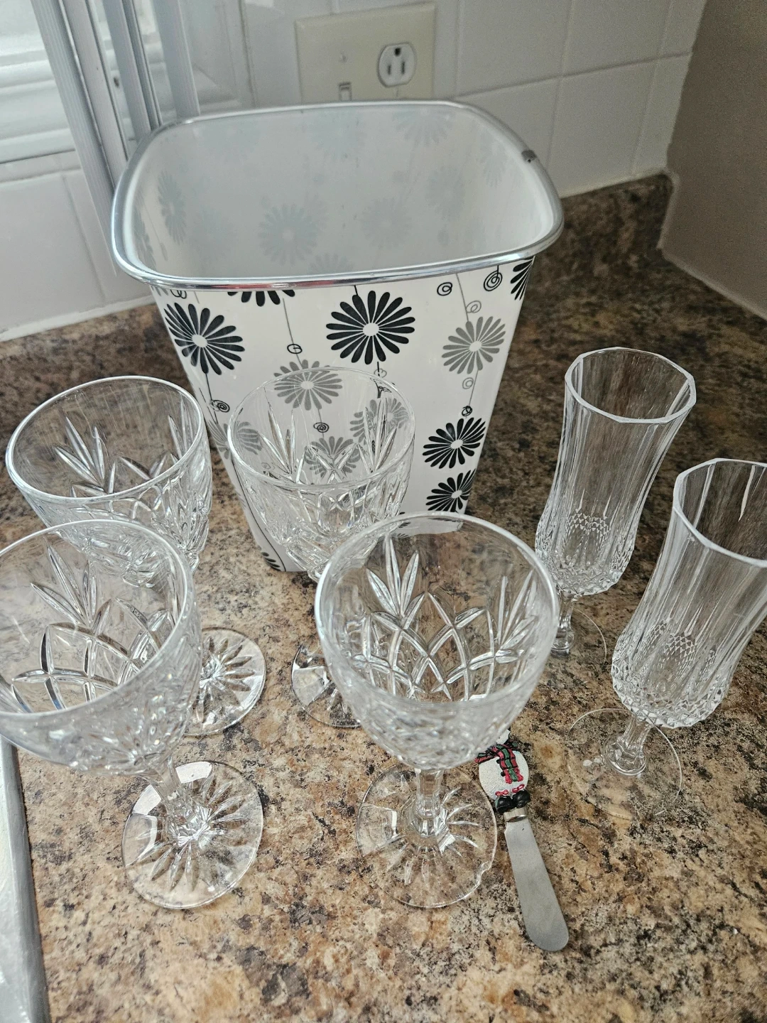 A set of six crystal wine glasses with intricate cut designs. It also includes a decorative serving bowl and a small decorative knife. Perfect for hosting gatherings