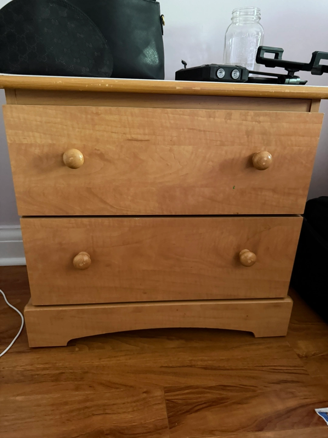 Selling a wooden nightstand with two drawers. It's in good condition and perfect for adding some extra storage to your bedroom. 1 drawer needs to fix, just need a screw and 1 handle just need to attach.