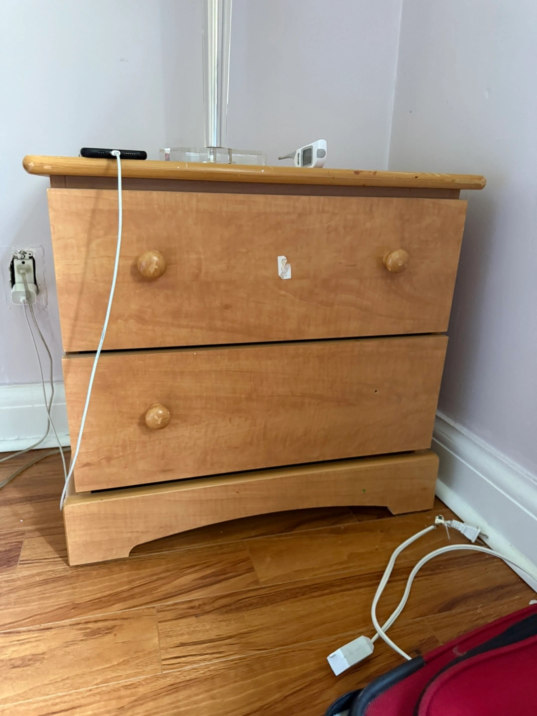 Selling a wooden nightstand with two drawers. It's in good condition and perfect for adding some extra storage to your bedroom. 1 drawer needs to fix, just need a screw and 1 handle just need to attach.