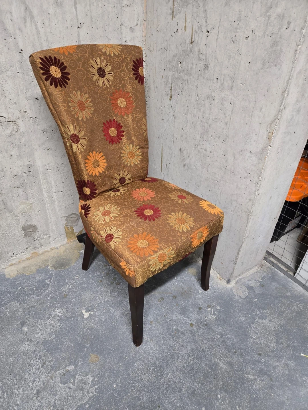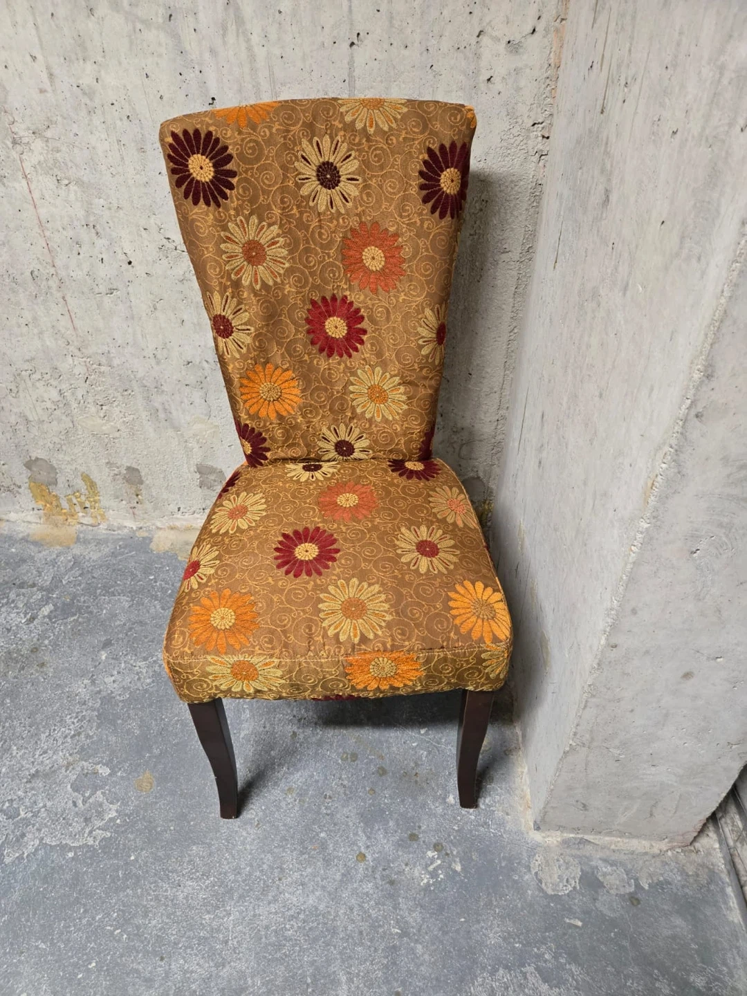 Sturdy high-back dining or accent chair. Upholstered in a durable fabric with a warm autumnal floral pattern and espresso-finished wood legs.
