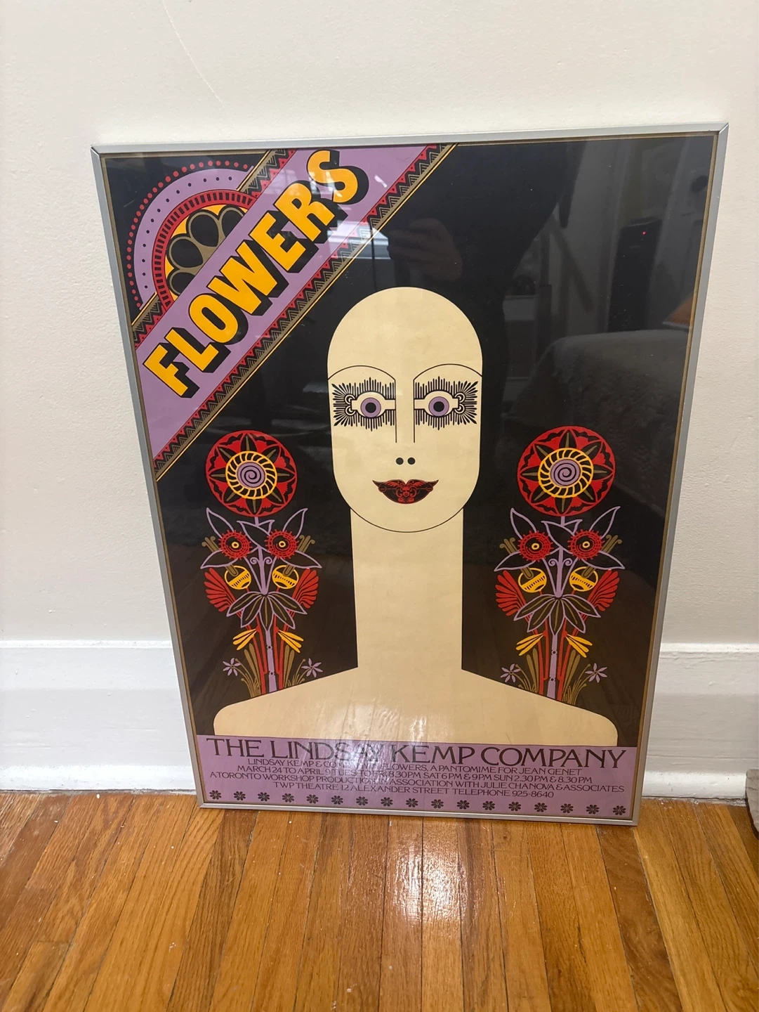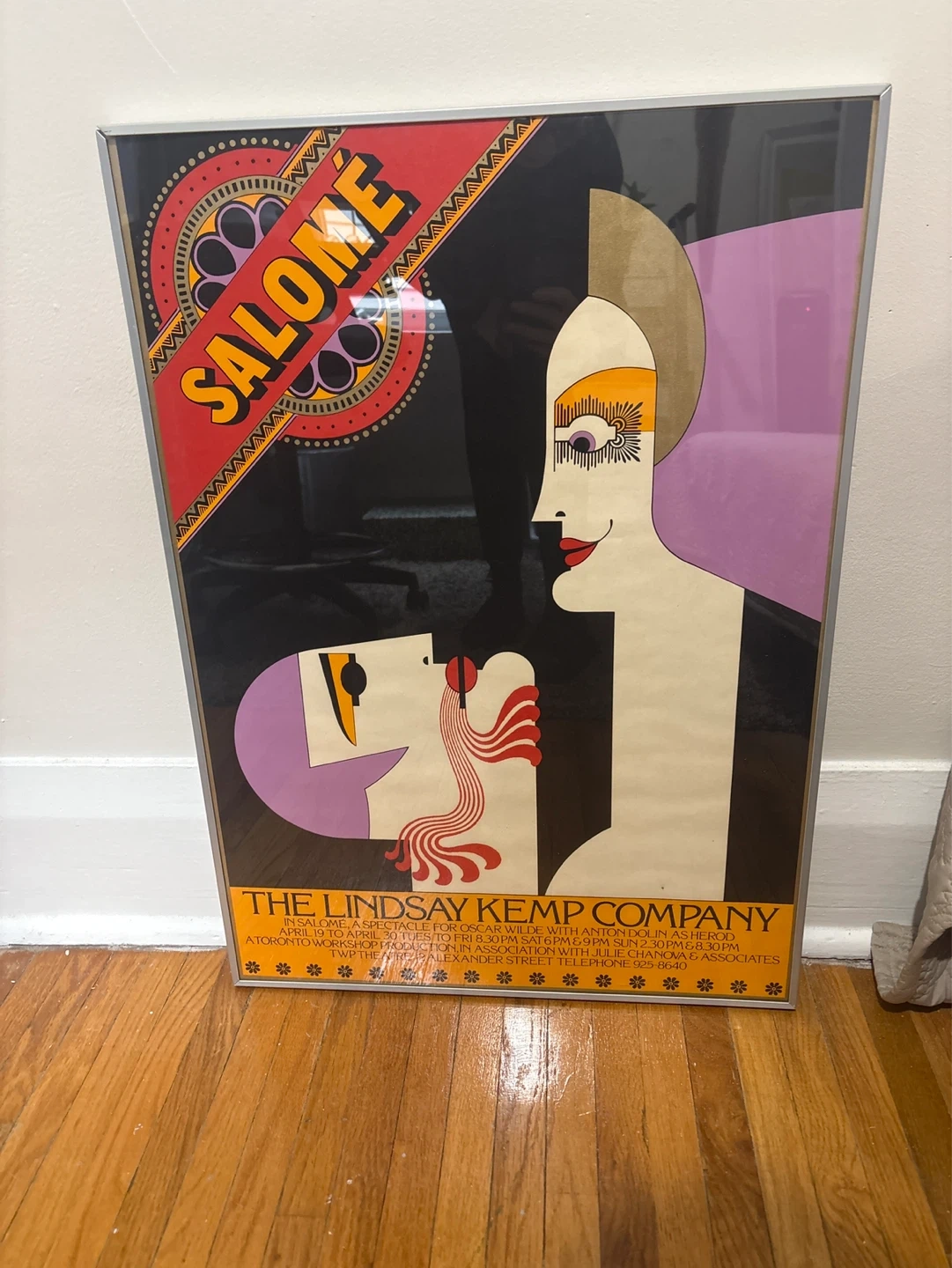 2 Vintage poster for The Lindsay Kemp Company's production of Salome. Features striking Art Deco-inspired graphics and text detailing performance dates and venue information. A unique piece for collectors or theatre enthusiasts!