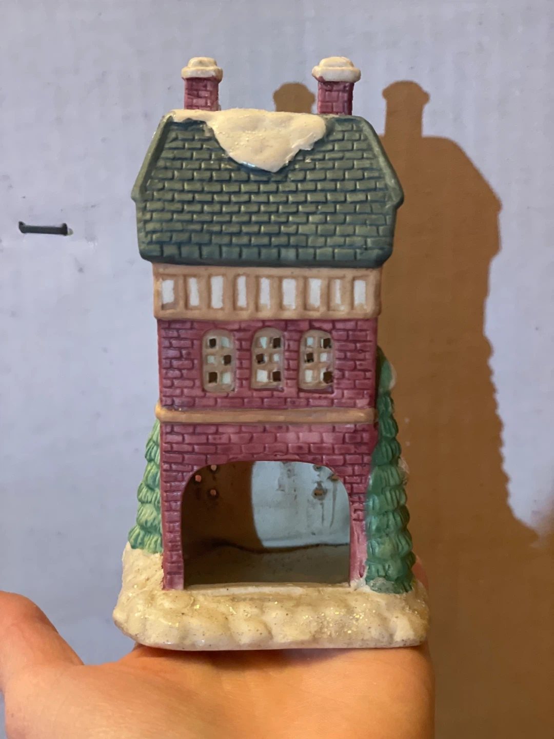 This festive ceramic house is perfect for your holiday decor. It features a charming design with a snowman accent and artificial snow. Place for small candle in back