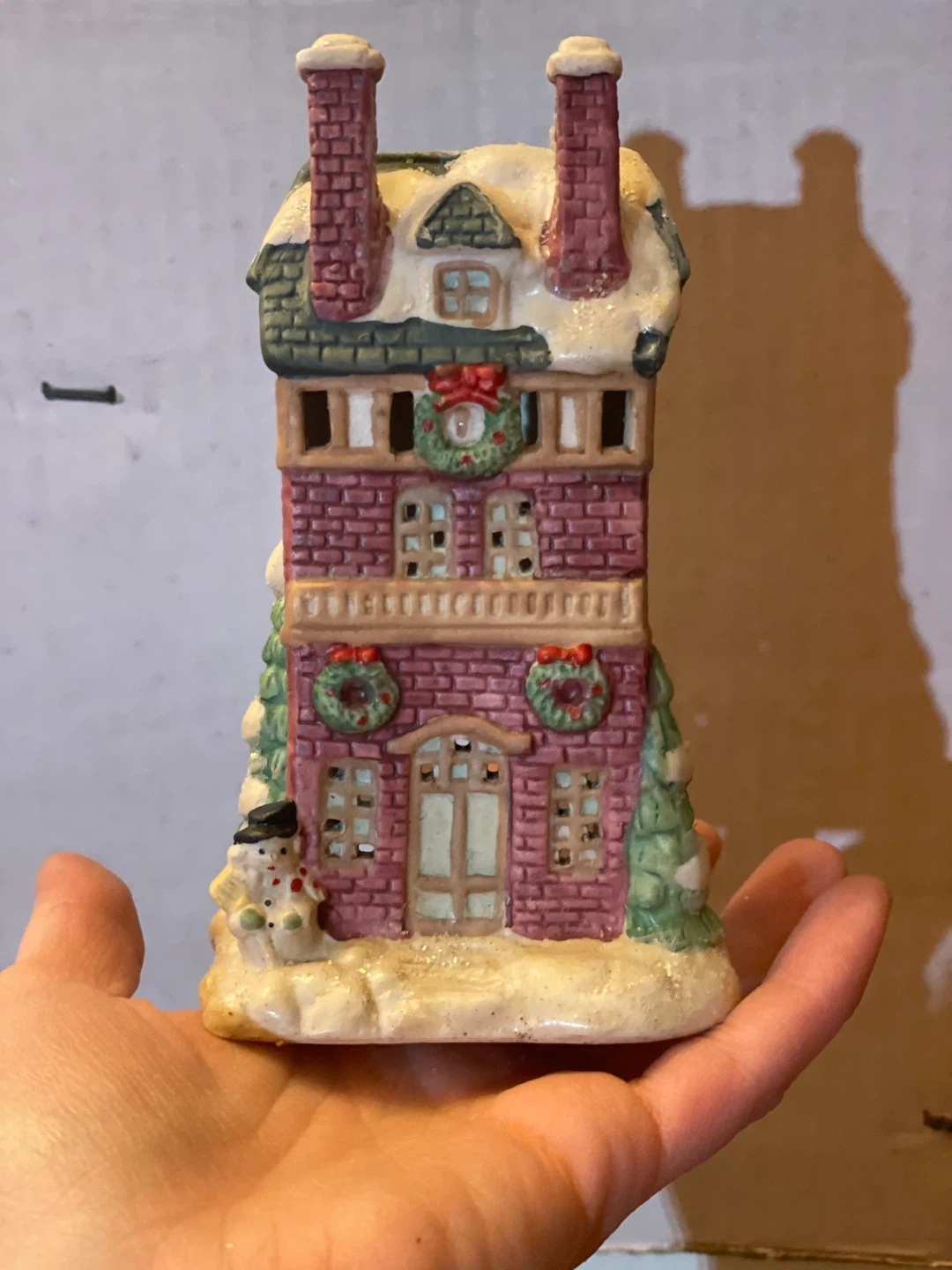 This festive ceramic house is perfect for your holiday decor. It features a charming design with a snowman accent and artificial snow. Place for small candle in back