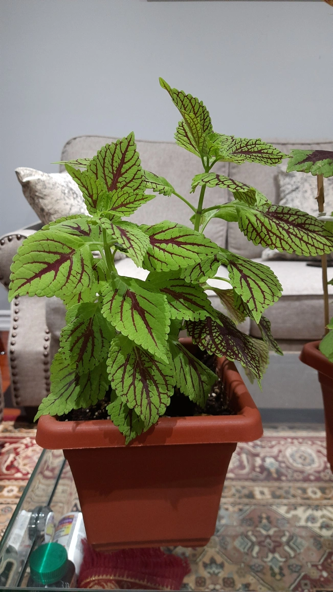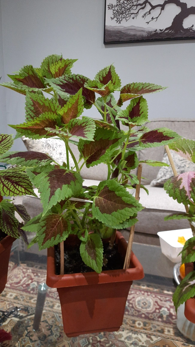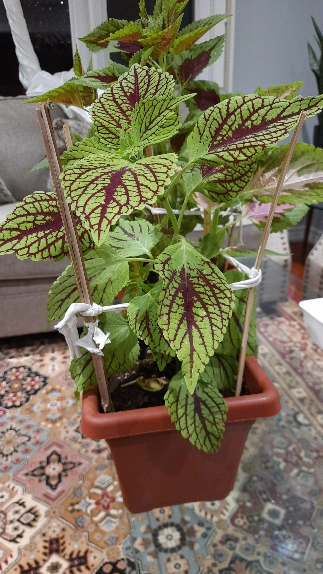 Healthy Coleus plant, vibrant green and maroon leaves. Growing in a terracotta coloured plastic pot. Bamboo stakes for support.